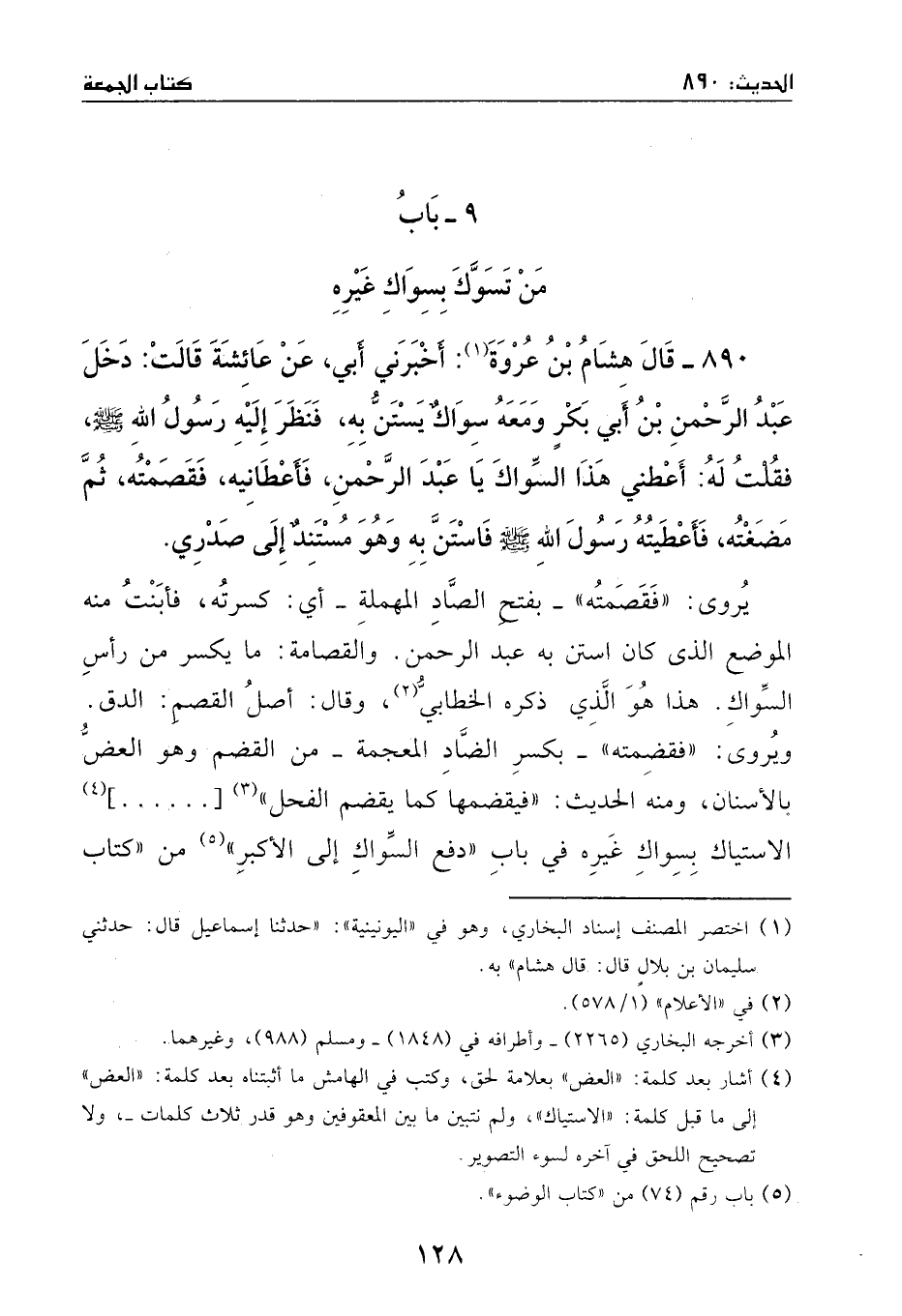 890 - حدثنا إسماعيل: حدثني سليمان بن بلال: قال هشام بن عروة: أخبرني أبي، عن عائشة، قالت: دخل عبد الرحمن بن أبي بكرٍ، ومعه سواكٌ يستن به، فنظر اليه رسول الله - صَلَّى اللهُ عَلَيْهِ وَسَلَّمَ -، فقلت له: أعطني هذا السواك يا عبد الرحمن، فاعطانيه، فقصمته، ثم مضغته، فاعطيته رسول الله - صَلَّى اللهُ عَلَيْهِ وَسَلَّمَ -، فاستن به، وهو مستند إلى صدري.