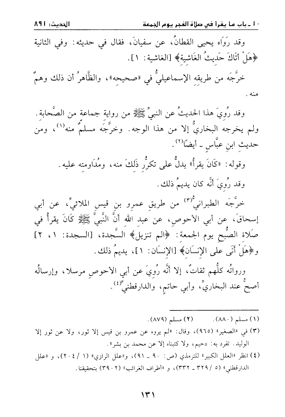 خرَّجه الطبراني من طريق عمروٍ بن قيس الملائي، عن أبي إسحاق، عن أبي الأحوص، عن عبد الله، أن النبي - صَلَّى اللهُ عَلَيْهِ وَسَلَّمَ - كان يقرا في صلاة الصبح يوم الجمعة {آلم تنزيل} السجدة و {هَلْ أَتَى عَلَى الإِنسَانِ} [الإنسان:1] .
