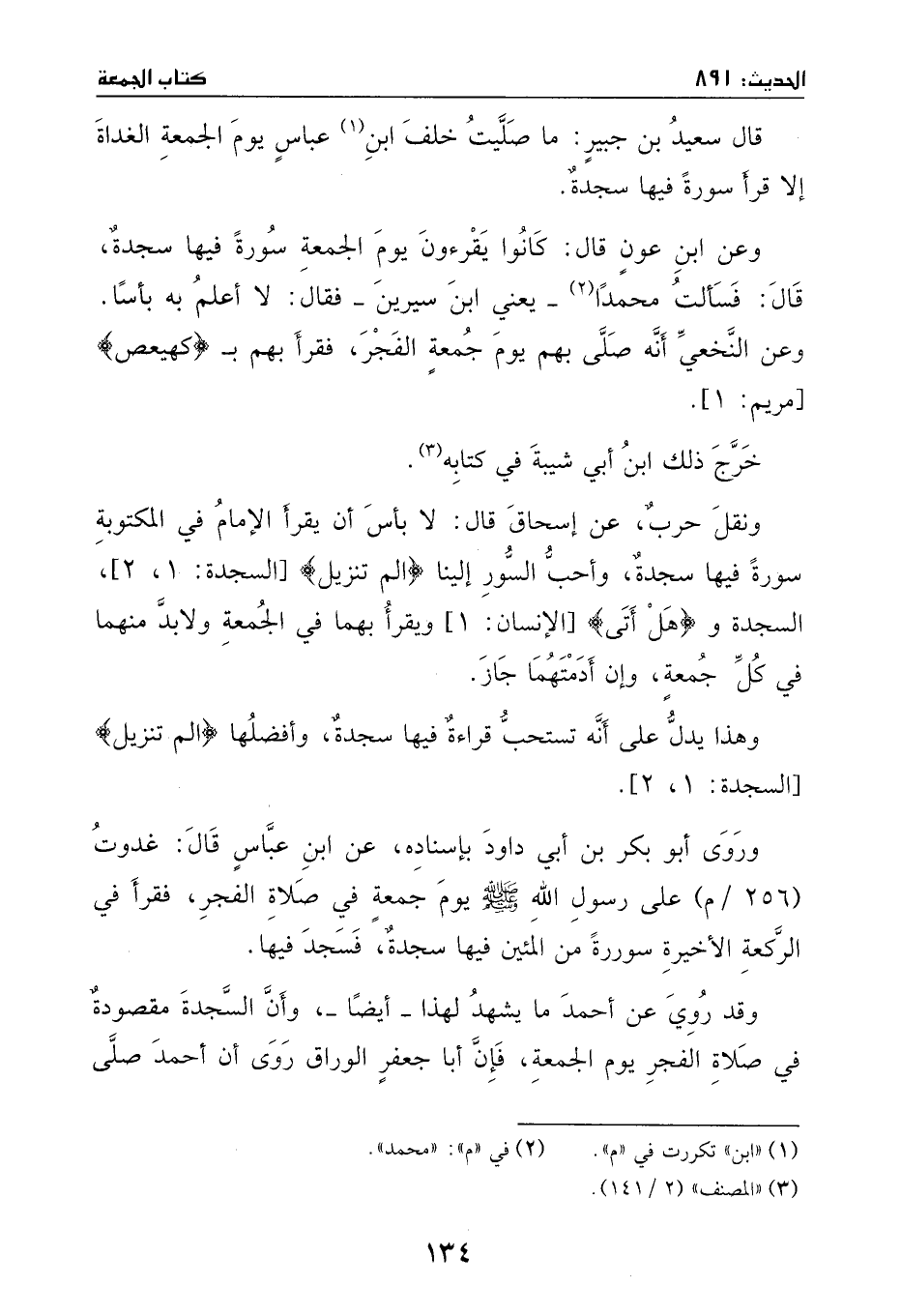 وعن ابن عوان، قال: كانوا يقرءون يوم الجمعة سورة فيها سجدةٌ، قال: فسألت محمداً –يعني: ابن سيرين -، فقال: لا أعلم به بأساً.