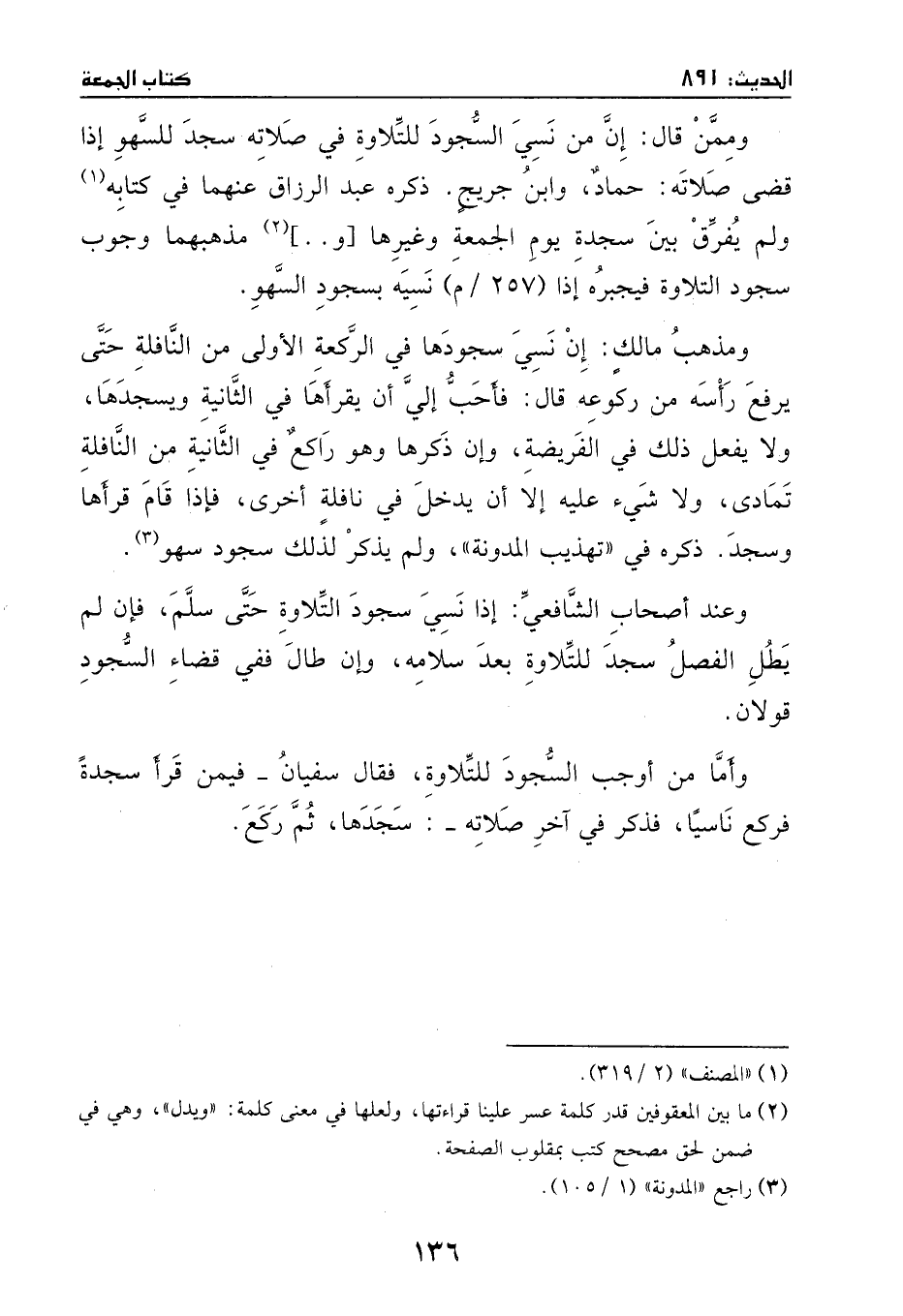 وممن قال: إن من نسي السجود للتلاوة في صلاته سجد للسهو إذا قضى صلاته: حمادٌ وابن جريجٍ -: ذكره عبد الرزاق عنهما في ((كتابه)) ، ولم يفرق بين سجدة يوم الجمعة وغيرها، ويحتمل أن مذهبهما وجوب سجود التلاوة، فيجبره إذا نسيه بسجود السهو.
