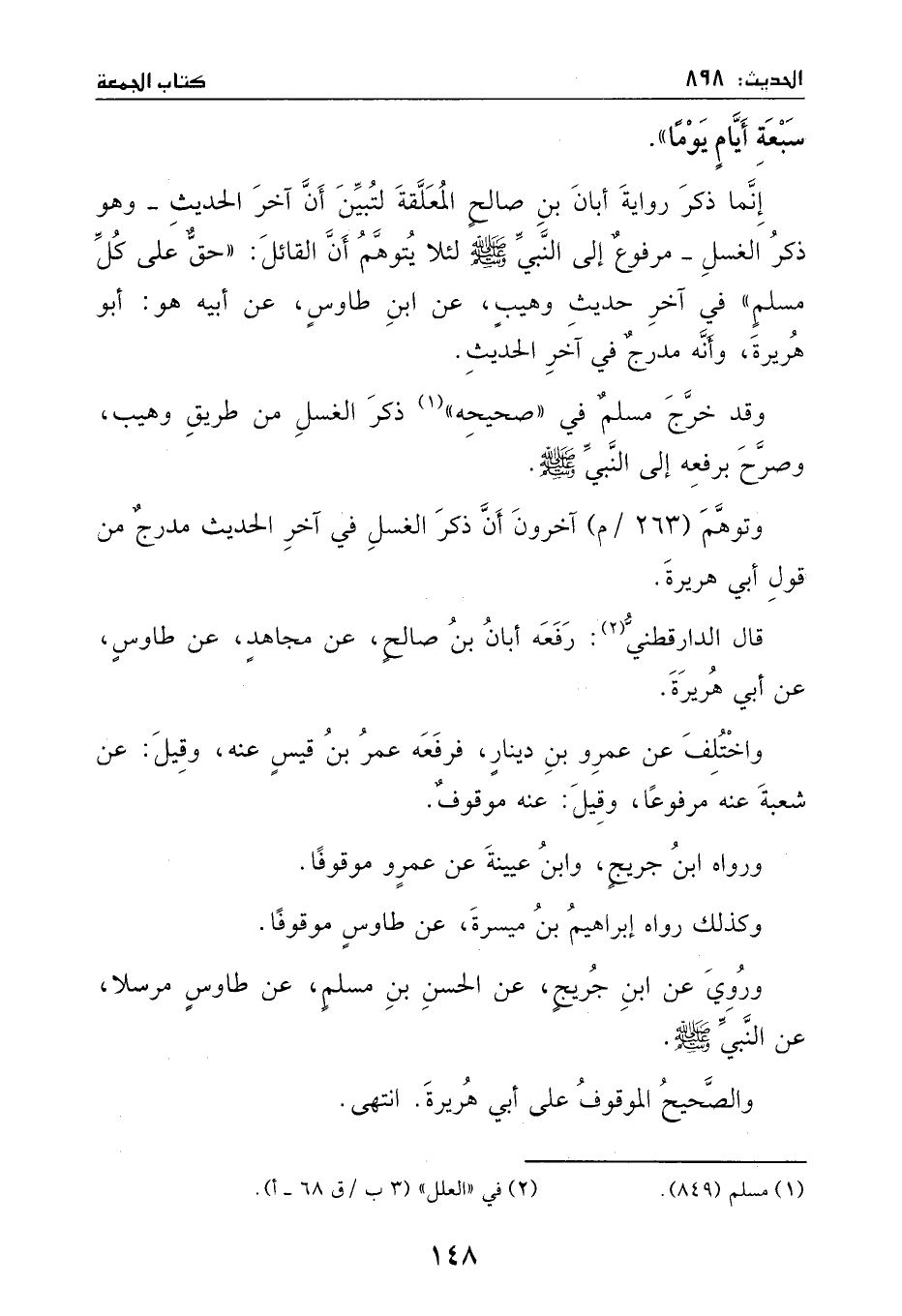 قال الدارقطني: رفعه أبان بن صالحٍ، عن مجاهدٍ: عن طاوسٍ، عن أبي هريرة، واختلف عن عمروٍ بن دينار: فرفعه عمر بن قيس، عنه. وقيل: عن شعبة، عنه –مرفوعاً. وقيل: عنه –موقوفٌ. ورواه ابن جريجٍ وابن عيينة، عن عمروٍ - موقوفاً. وكذلك رواه إبراهيم بن ميسرة، عن طاوس –موقوفاً، وروي عن ابن جريجٍ، عن الحسن بن مسلم، عن طاوس –مرسلاً -، عن النبي - صَلَّى اللهُ عَلَيْهِ وَسَلَّمَ - والصحيح الموقوف على أبي هريرة. انتهى.