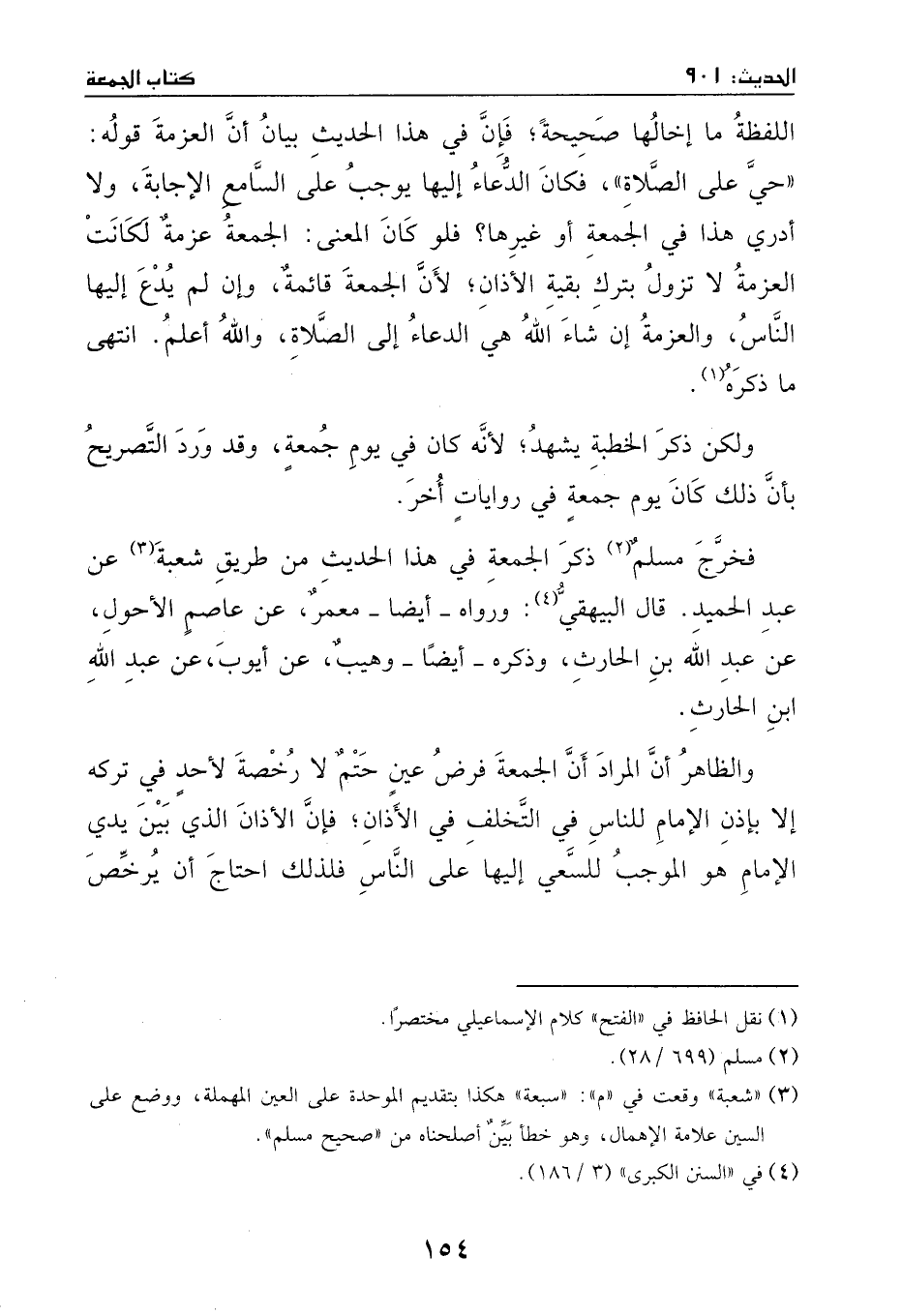 اللفظة ما إخالها صحيحةً، فإن في هذا الحديث بيان أن العزمة قوله: ((حي على الصلاة)) فكأن الدعاء إليها يوجب على السامع الإجابة، ولا أدري هذا في الجمعة أو غيرها، فلو كان المعنى: الجمعة عزمةٌ، لكانت العزمة لا تزول بترك بقية الأذان، لأن الجمعة قائمة، وإن لم يدع إليها الناس، والعزمة –إن شاء الله – هي الدعاء إلى الصلاة. والله أعلم. انتهى ما ذكره.