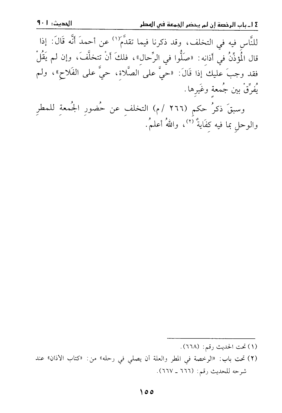 وقد ذكرنا فيما تقدم، عن أحمد، أنَّهُ قالَ: إذا قالَ المؤذن في أذانه: ((صلوا في الرحال)) فلك أن تتخلف، وإن لم يقل، فقد وجب عليك أذاً قالَ: ((حي على الصَّلاة، حي على الفلاح)) .