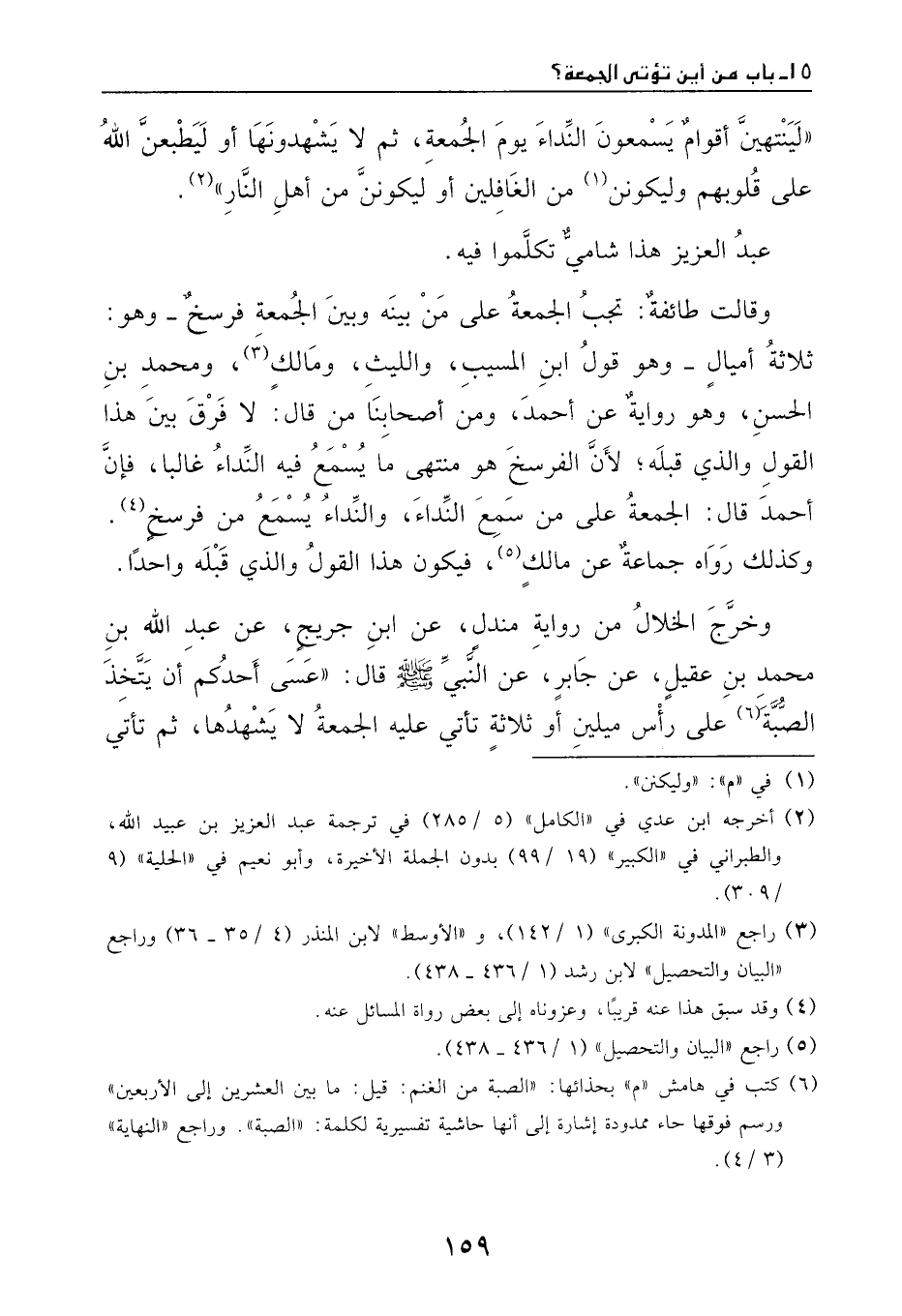 وخرّج الخلال من رواية مندل، عن ابن جريج، عن عبد الله بن محمد بن عقيل، عن جابر، عن النبي - صَلَّى اللهُ عَلَيْهِ وَسَلَّمَ - قال: ((عسى أحدكم أن يتخذ الصبة على رأس ميلين أو ثلاثة، تأتي عليه الجمعة لا يشهدها، ثم تأتي
