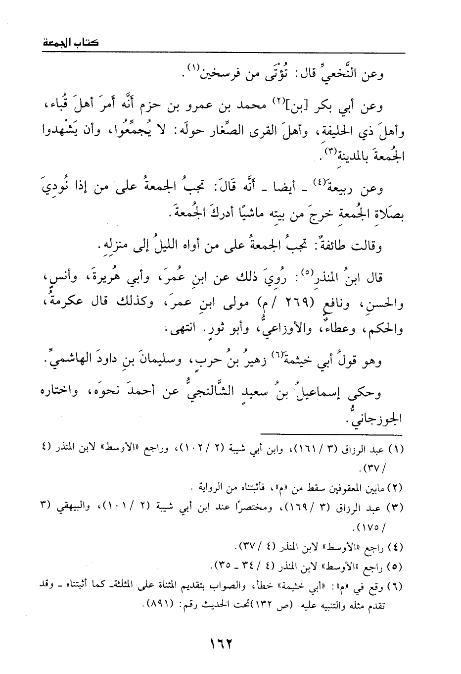 وعن النخعي، قال: تؤتى الجمعة من فرسخين.