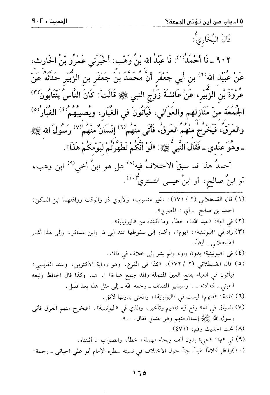 نا أحمد: نا عبد الله بن وهبٍ: أخبرني عمرو بن الحارث، عن عبيد الله بن أبي جعفر، أن محمد بن جعفرٍ بن الزبير حدثه، عن عروة بن الزبير، عن عائشة –زوج النبي - صَلَّى اللهُ عَلَيْهِ وَسَلَّمَ -، قالت: كان الناس ينتابون الجمعة من منازلهم والعوالي، فياتون في الغبار، يصيبهم الغبار والعرق، فيخرج منهم العرق، فأتى إنسان منهم رسول الله - صَلَّى اللهُ عَلَيْهِ وَسَلَّمَ - وهو عندي -، فقال النبي - صَلَّى اللهُ عَلَيْهِ وَسَلَّمَ -: ((لو أنكم تطهرتم ليومكم هذا)) .