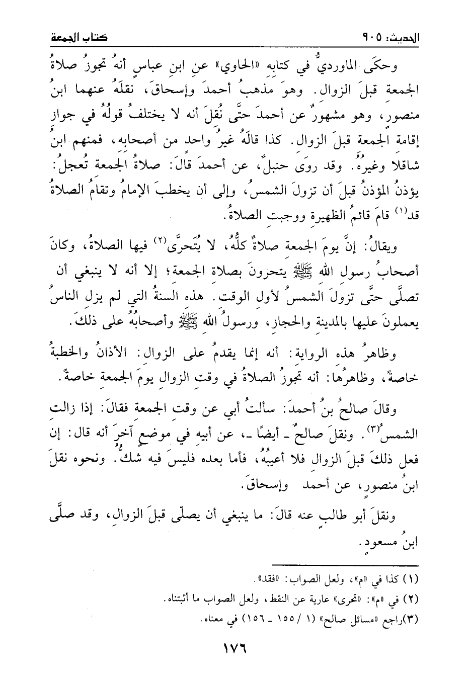 وقد روى حنبل، عن أحمد، قال: صلاة الجمعة تعجل، يؤذن المؤذن قبل أن تزول الشمس، وإلى أن يخطب الإمام، وتقام الصلاة، قد قام قائم الظهيرة، ووجبت الصلاة، ويقال: إن يوم الجمعة صلاةٌ كله لا تحرى فيها الصلاة، وكان أصحاب
