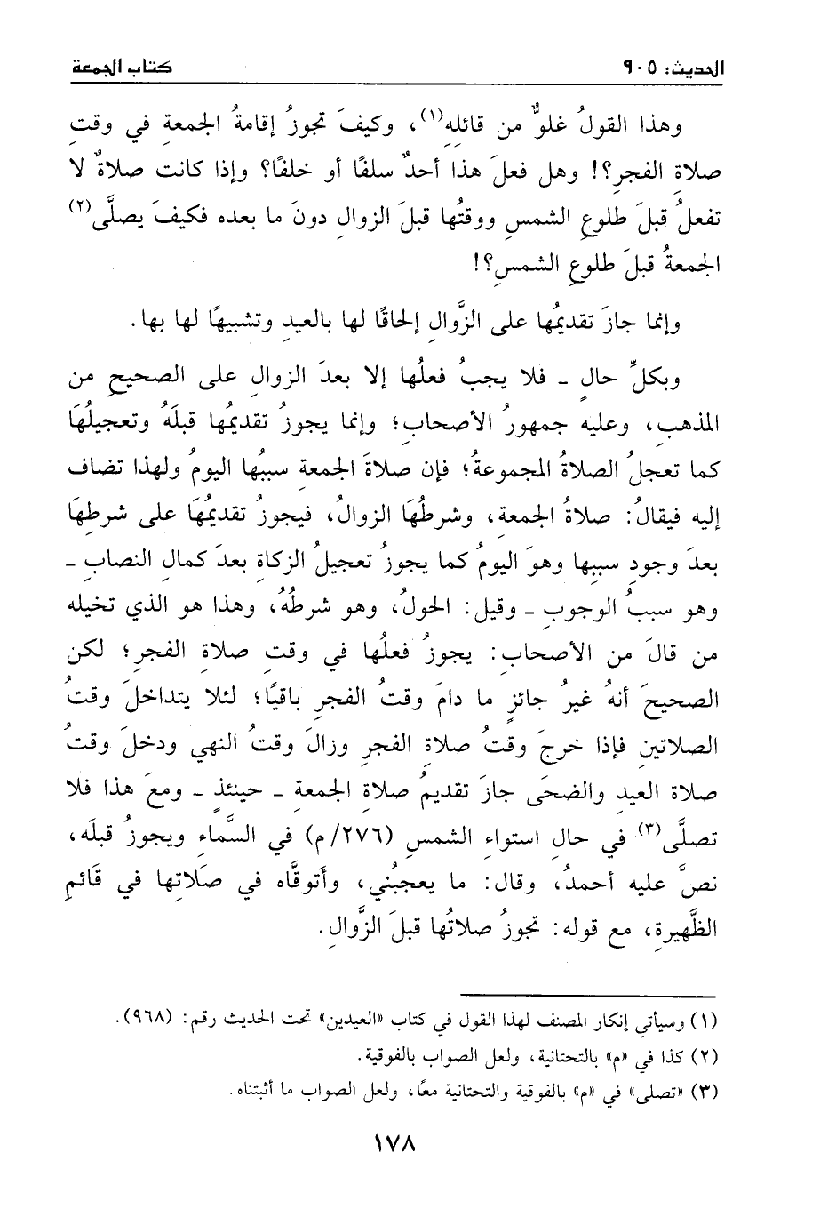 وهذا القول غلوٌ من قائله، وكيف يجوز إقامة الجمعة في وقت صلاة الفجر؟! وهل فعل هذا أحدٌ سلفاً أو خلفاً؟! وإذا كانت صلاة لا تفعل قبل طلوع الشمس، ووقتها قبل الزوال دون ما بعده، فكيف تصلي الجمعة قبل طلوع الشمس، وإنما جاز تقديمها على الزوال إلحاقاً لها بالعيد، وتشبيهاً لها بها.