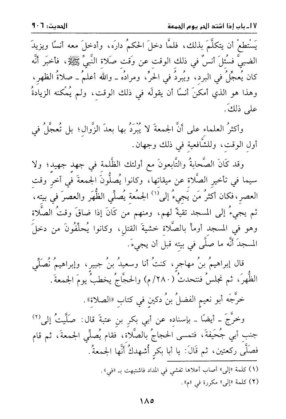 وخَّرج –أيضاً - بإسناده، عن أبي بكر بن عتبة، قال صليت إلى جنب أبي جحيفة، فتمسى الحجاج بالصلاة، فقام يصلي الجمعة، ثم قام فصلى ركعتين، ثم قال: يا أبا بكر، أشهدك أنها الجمعة.