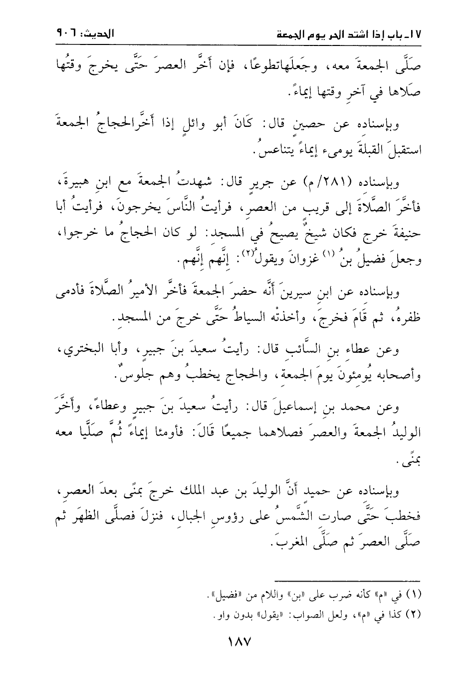 وبإسناده: عن حصينٍ، قال: كان أبو وائل إذا أخر الحجاج الجمعة استقبل القبلة، يومئ ايماءً: يتناعس.