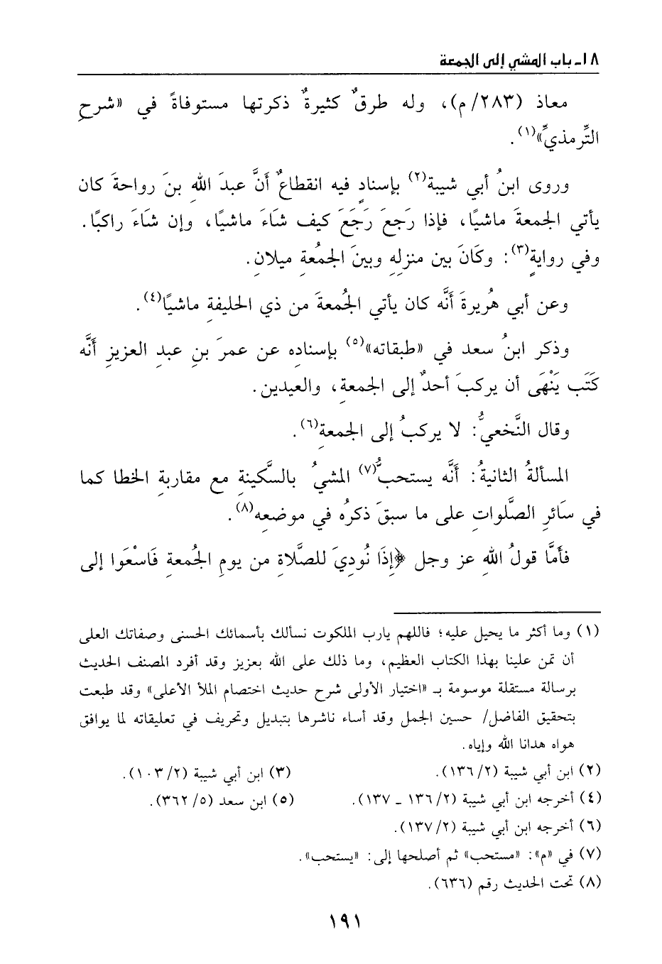 وروى ابن أبي شيبة بإسنادٍ فيه انقطاعٌ، أن عبد الله بن رواحة كان يأتي الجمعة ماشياً، فإذا رجع كيف شاء ماشياً، وإن شاء راكباً.