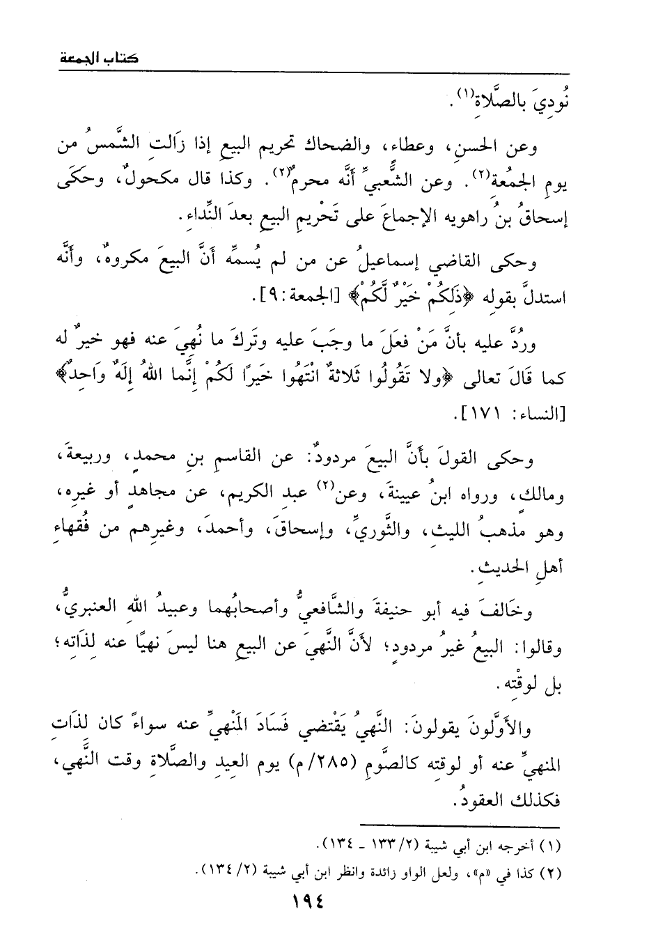 وخالف فيه أبو حنيفة والشافعي واصحابهما وعبيد الله العنبري، وقالوا: البيع غير مردودٍ؛ لأن النهي عن البيع هنا ليس نهياً عنه لذاته بل لوقته.
