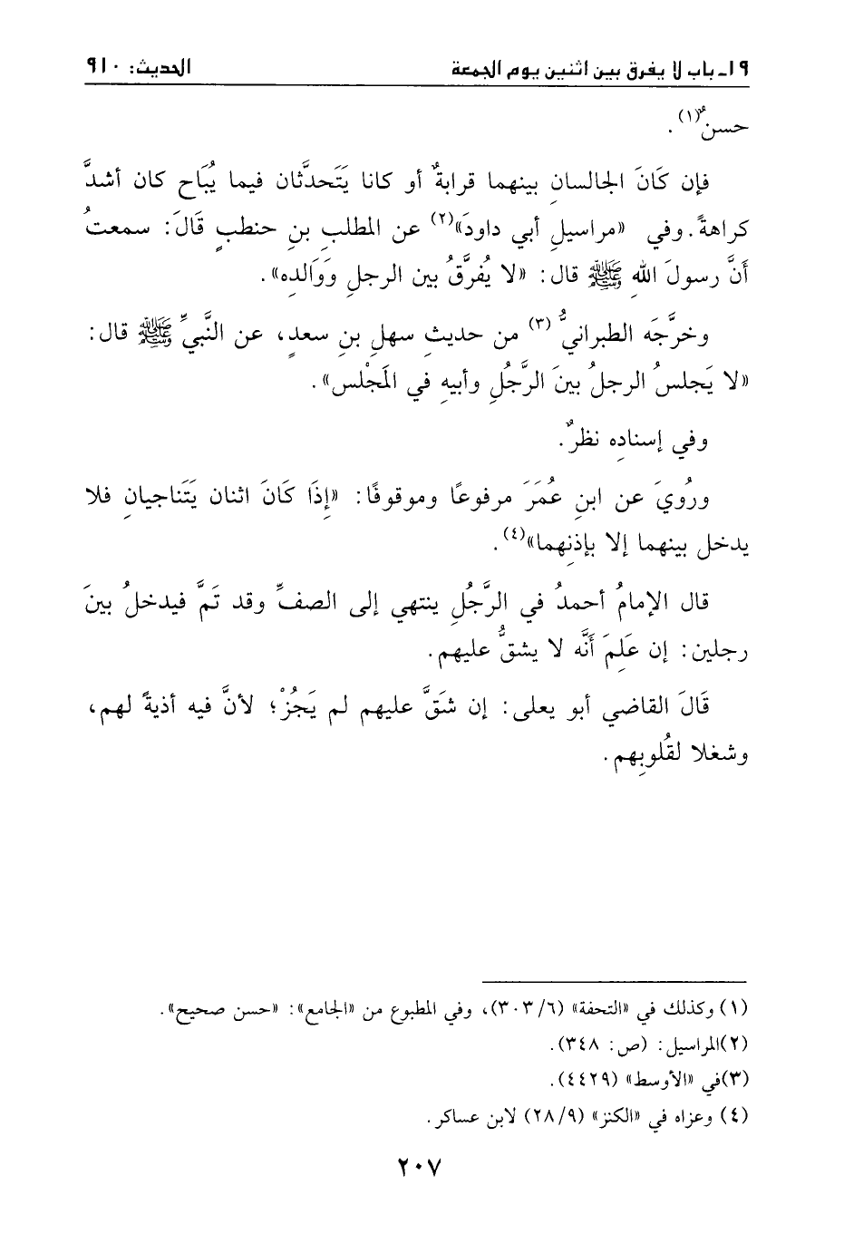 وروي عن ابن عمر – مرفوعاً، وموقوفاً -: ((إذا كان اثنان يتناجيان فلا يدخل بينهما إلا بإذنهما)) .