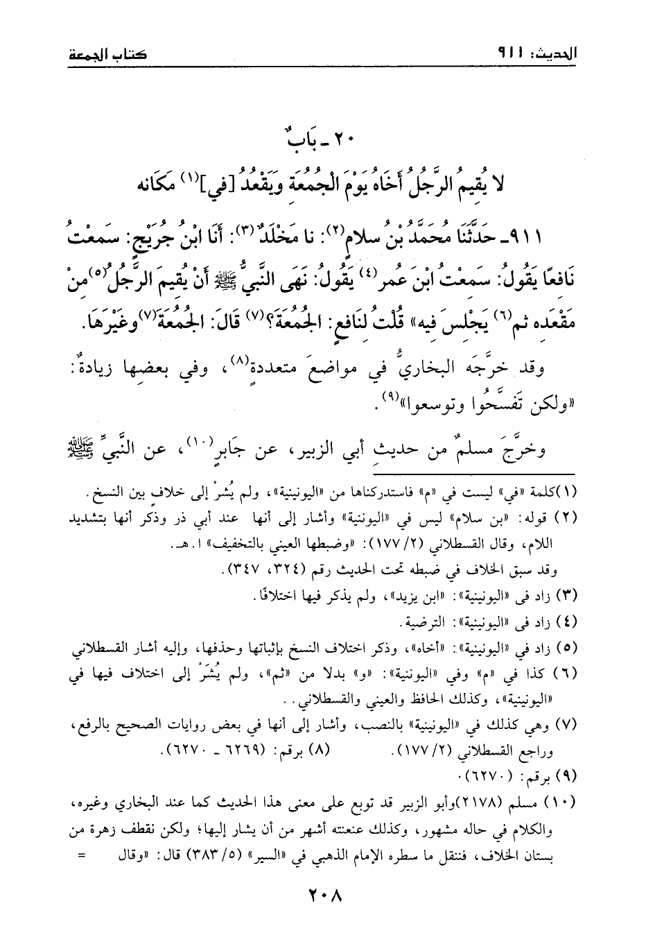 911 - حدثنا محمد بن سلام: ثنا مخلد: أنا ابن جريجٍ: سمعت نافعا يقول: سمعت ابن عمر يقول: نهى النبي - صَلَّى اللهُ عَلَيْهِ وَسَلَّمَ - أن يقيم الرجلُ الرجل من مقعده، ثم يجلس فيهِ)) .
