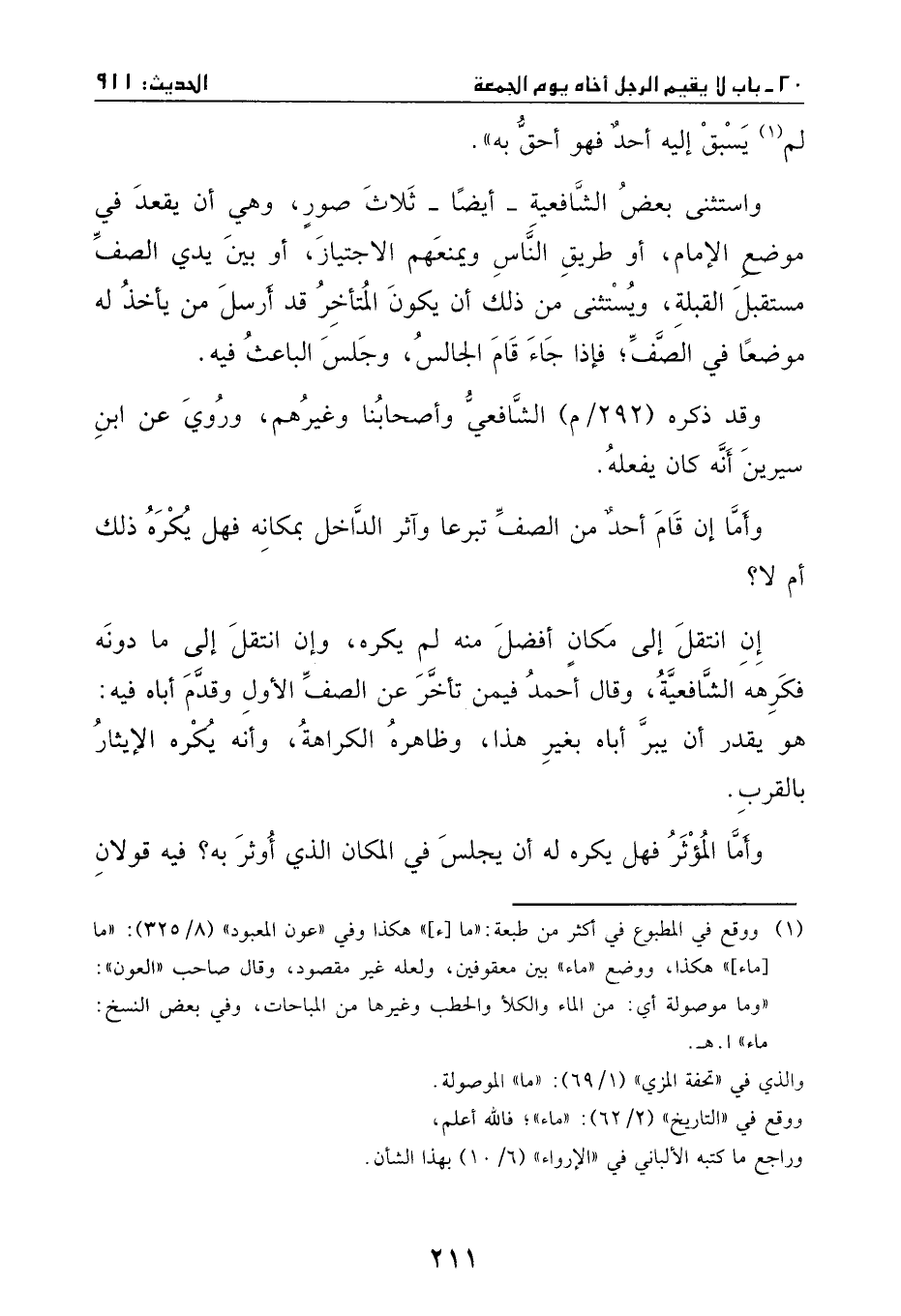 ويستثنى من ذلك، أن يكون المتاخر قد ارسل من ياخذ له موضعاً في الصف، فاذا جاء الجالس وجلس الباعث فيه. وقد ذكره الشافعي وأصحابنا وغيرهم.
