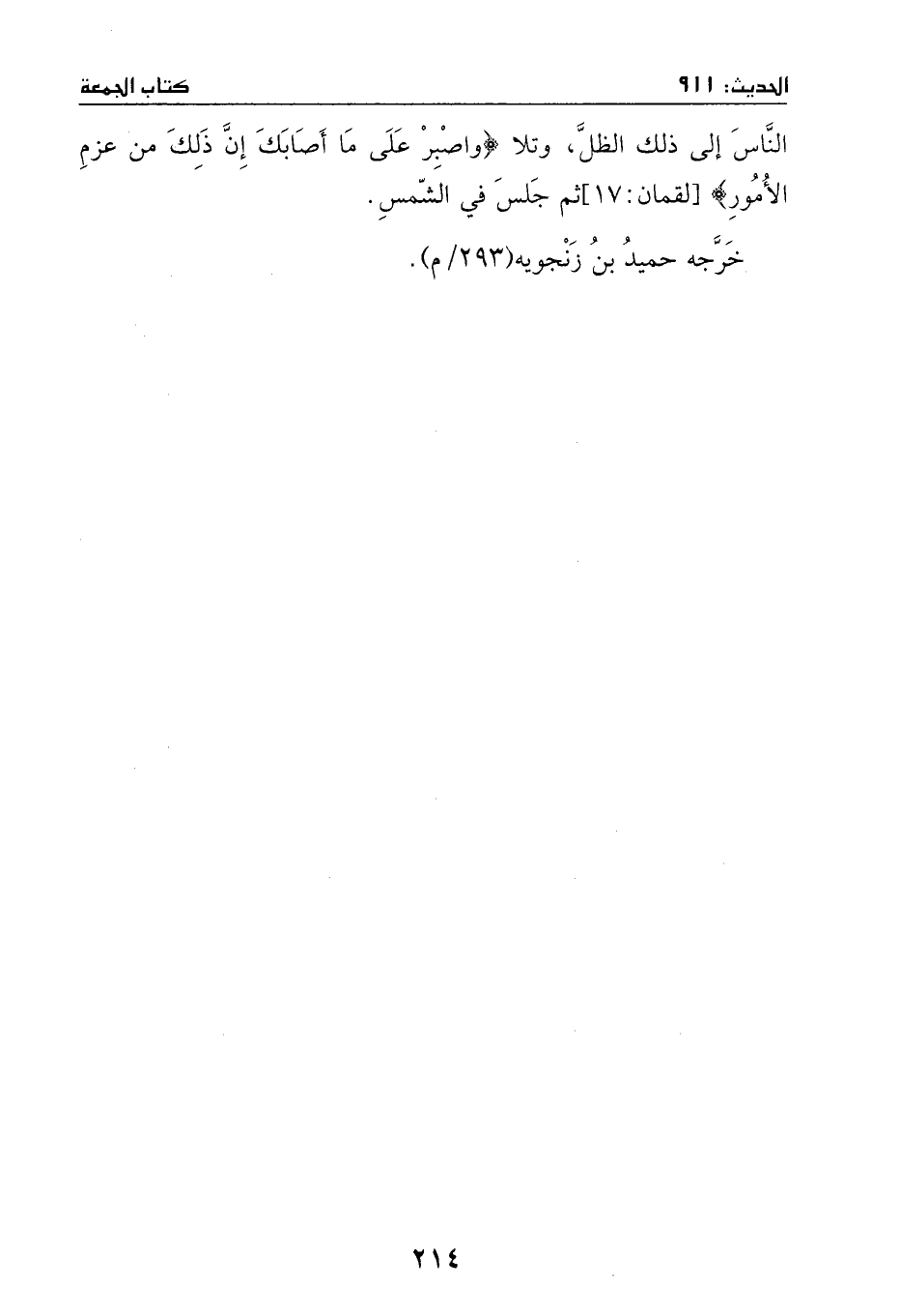 الناس إلى ذلك الظل، وتلا: {وَاصْبِرْ عَلَى مَا أَصَابَكَ إِنَّ ذَلِكَ مِنْ عَزْمِ الأُمُورِ} [لقمان:17] ، ثم جلس في الشمس.