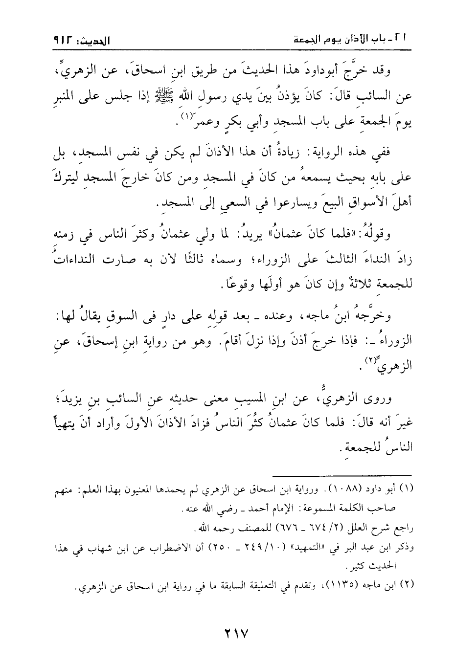 وقد خَّرج أبو داود هذا الحديث من طريق ابن إسحاق، عن الزهري، عن السائب، قال: كان يؤذن بين يدي رسول الله - صَلَّى اللهُ عَلَيْهِ وَسَلَّمَ - إذا جلس على المنبر يوم الجمعة على باب المسجد، وأبي بكر وعمر.