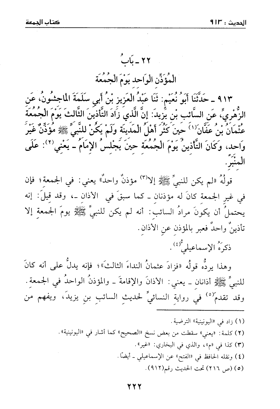 913 - حدثنا أبو نعيمٍ: ثنا عبد العزيز بن أبي سلمة الماجشون، عن الزهري، عن السائب بن يزيد، أن الذي زاد التأذين الثالث يوم الجمعة عثمان بن عفان، حين كثر أهل المدينة، ولم يكن للنبي - صَلَّى اللهُ عَلَيْهِ وَسَلَّمَ - غير مؤذنٍ واحدٍ، وكان التأذين يوم الجمعة حين يجلس الإمام –يعني: على المنبر.