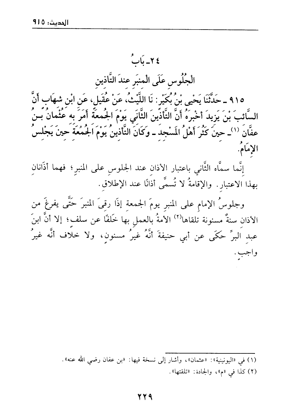 915 - حدثنا يحيى بن بكير: ثنا الليث، عن عقيلٍ، عن ابن شهابٍ، أن السائب بن يزيد أخبره، أن التأذين الثاني يوم الجمعة أمر به عثمان بن عفان حين كثر أهل المسجد، وكان التأذين يوم الجمعة حين يجلس الإمام.