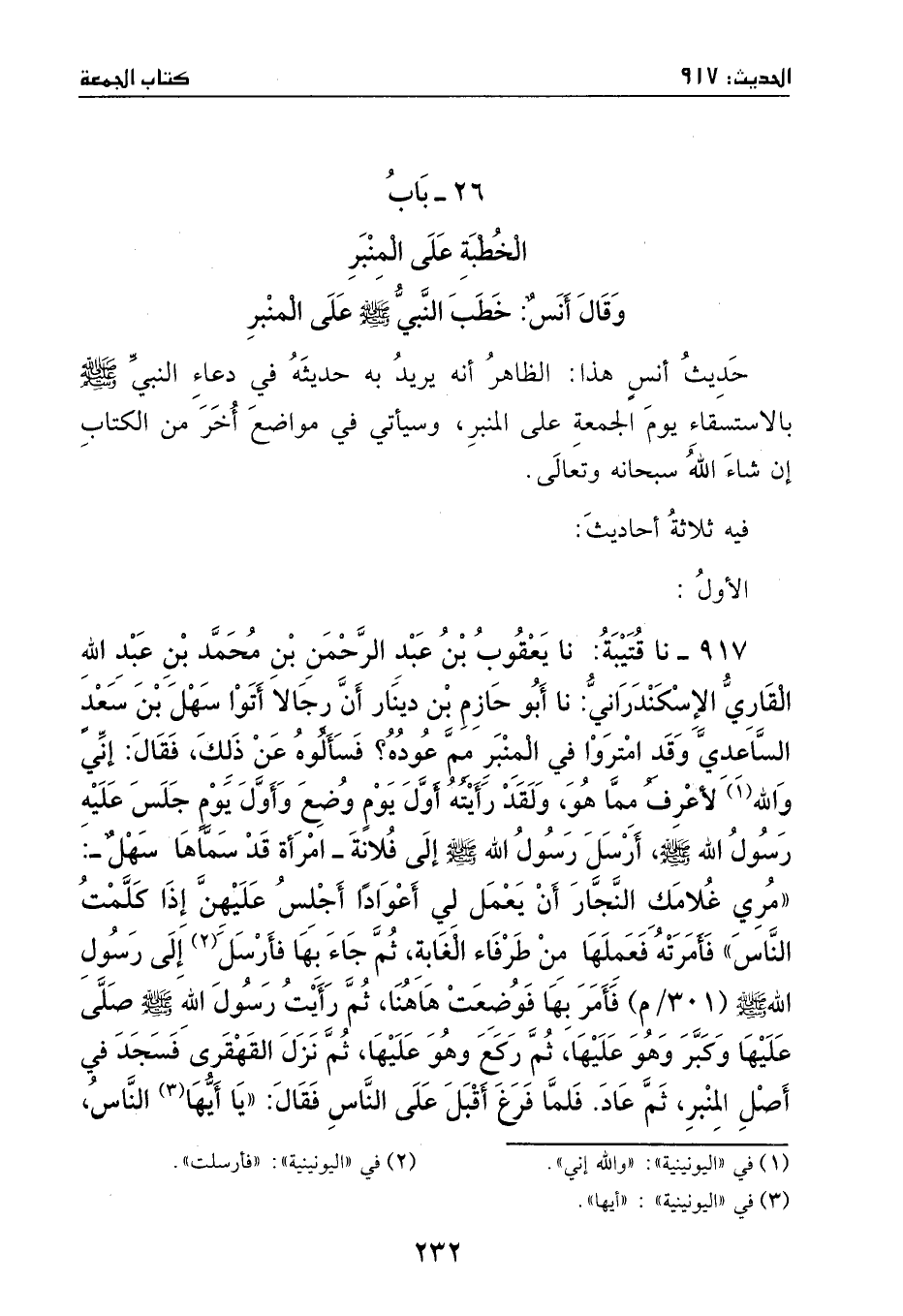 نا قتيبة: نا يعقوب بن عبد الرحمن بن محمد بن عبد الله القاري الاسكندراني: نا أبو حازم بن دينار، أن رجالاً أتوا سهل بن سعدٍ الساعدي، وقد امتروا في المنبر: مم عوده؟ فسألوه عن ذَلِكَ، فقالَ: إني والله: لأعرف مما هوَ، ولقد رأيته أول يوم وضع، وأول يوم جلس عليهِ رسول الله - صَلَّى اللهُ عَلَيْهِ وَسَلَّمَ -، أرسل رسول الله - صَلَّى اللهُ عَلَيْهِ وَسَلَّمَ - إلى فلانة –امرأة قد سماها سهل -: ((مري غلامك النجار أن يعمل لي أعواداً أجلس عليهن إذا كلمت الناس)) ، فأمرته، فعملها من طرفاء الغابة، ثُمَّ جاء بها، فارسلت إلى