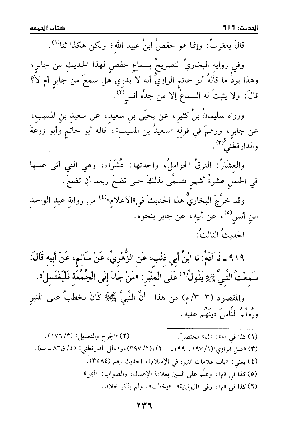 وفي روايةٍ البخاري: التصريح بسماع حفص لهذا الحديث من جابر، وهذا يرد ما قاله أبو حاتم الرازي: إنه لا يدري: هل سمع من جابر، أم لا؟ قال: ولا يثبت له السماع إلا من جده أنس.