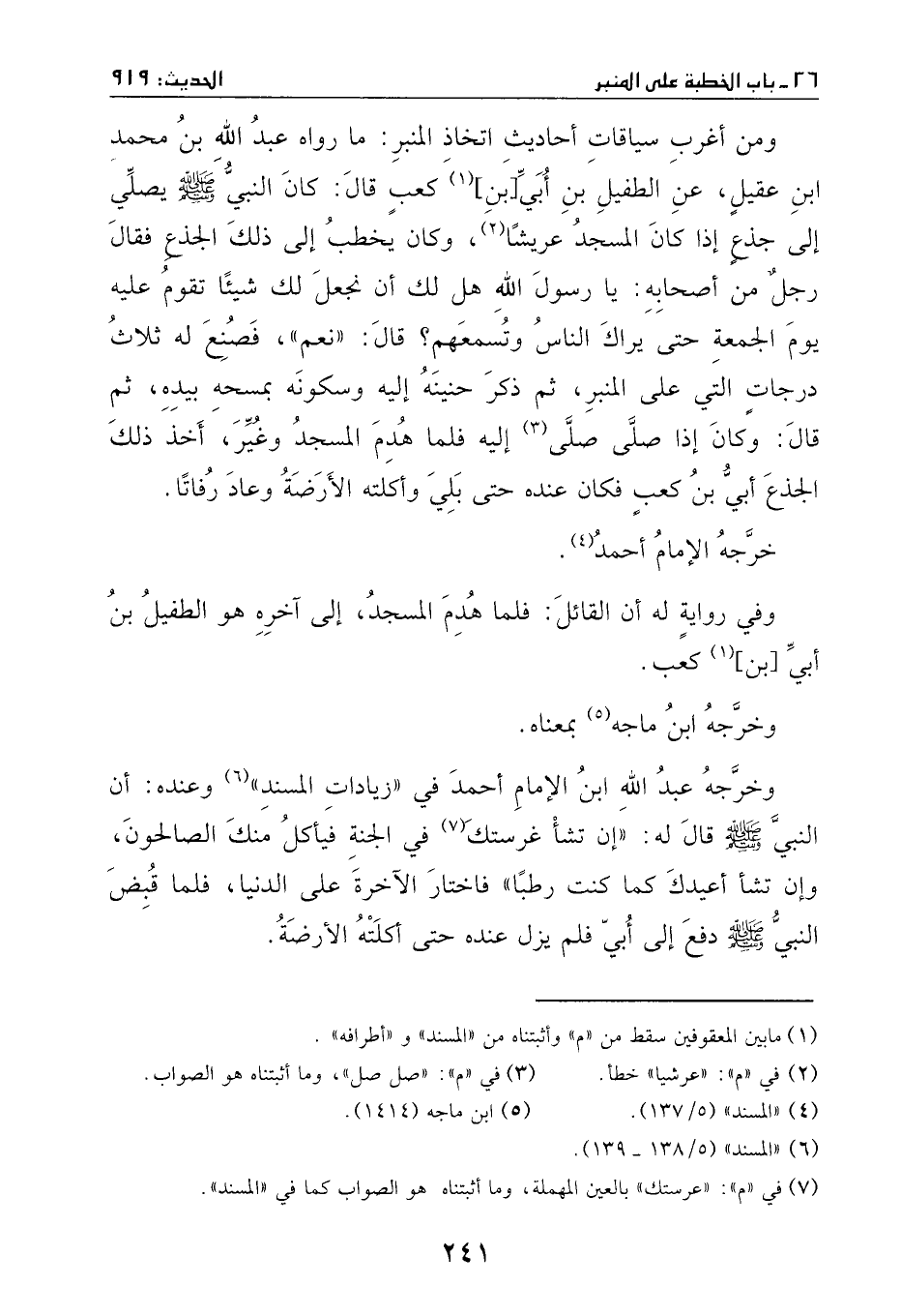 ومن أغرب سياقات أحاديث اتخاذ المنبر: ما رواه عبد الله بن محمد بن عقيل، عن الطفيل بن أبي بن كعب، عن أبيه، قال: كان النبي - صَلَّى اللهُ عَلَيْهِ وَسَلَّمَ - يصلي إلى جذع، إذ كان المسجد عريشاً، وكان يخطب إلى ذلك الجذع، فقال رجل من أصحابه: يا رسول الله، هل لك أن نجعل لك شيئاً تقوم عليه يوم الجمعة حتى يراك الناس وتسمعهم؟ قالَ: