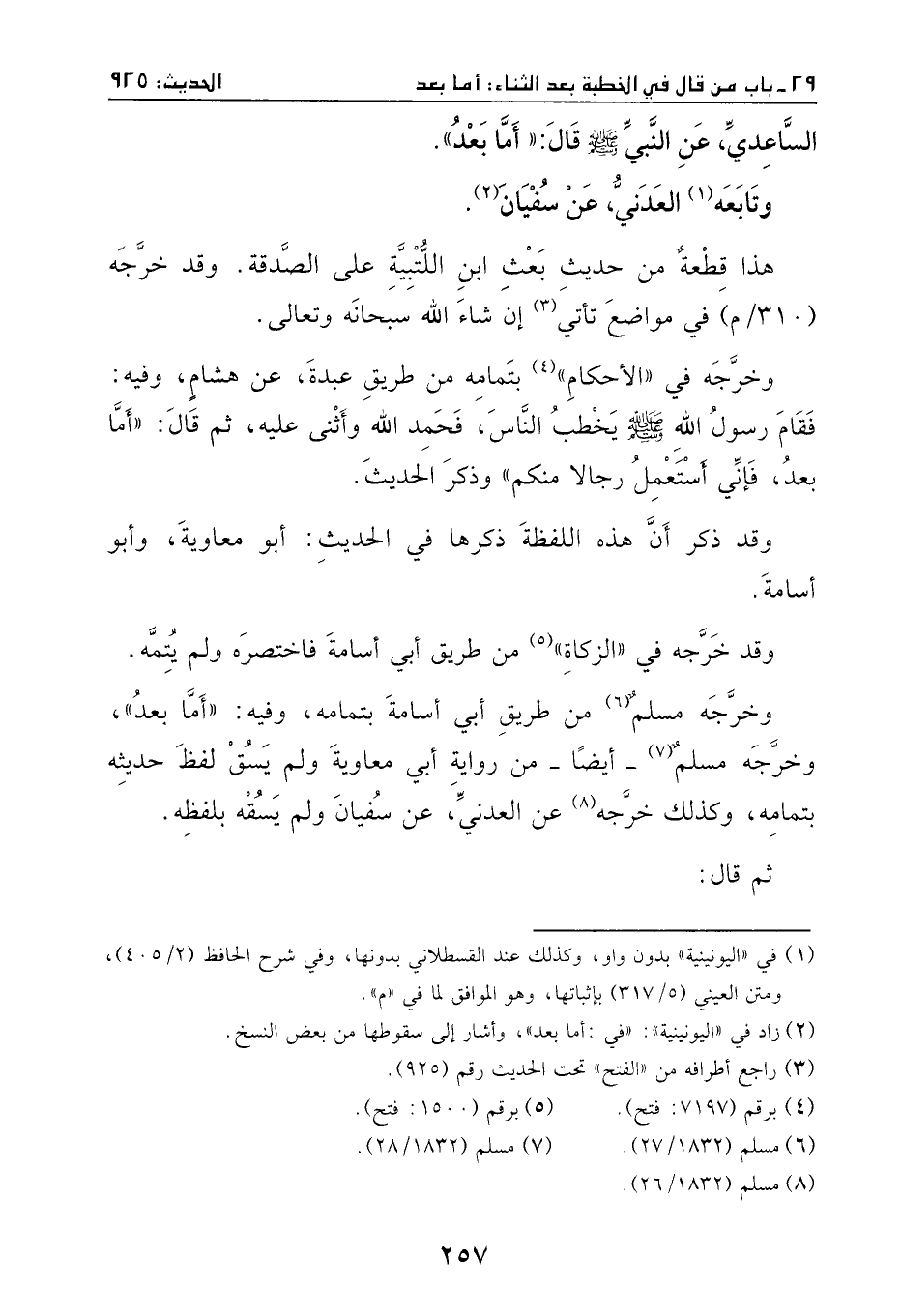 الساعدي، عن النبي - صَلَّى اللهُ عَلَيْهِ وَسَلَّمَ -، قال: ((أما بعد)) .