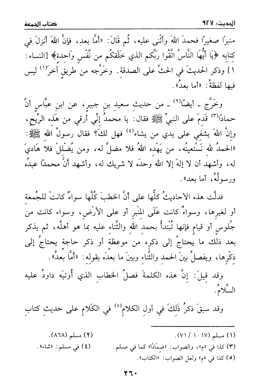وخرّجه من طريق أخرى، ليس فيها لفظه: ((أما بعد)) .