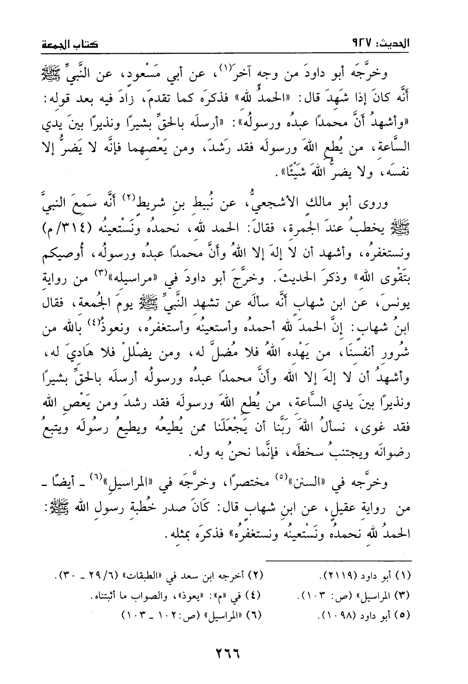 وخرّج أبو داود في ((مراسليه)) من روايةٍ يونس، عن ابن شهاب، أنه سأله عن تشهد النبي - صَلَّى اللهُ عَلَيْهِ وَسَلَّمَ - يوم الجمعة؟ فقالَ ابن شهاب: ((أن الحمد لله وحده واستعينه