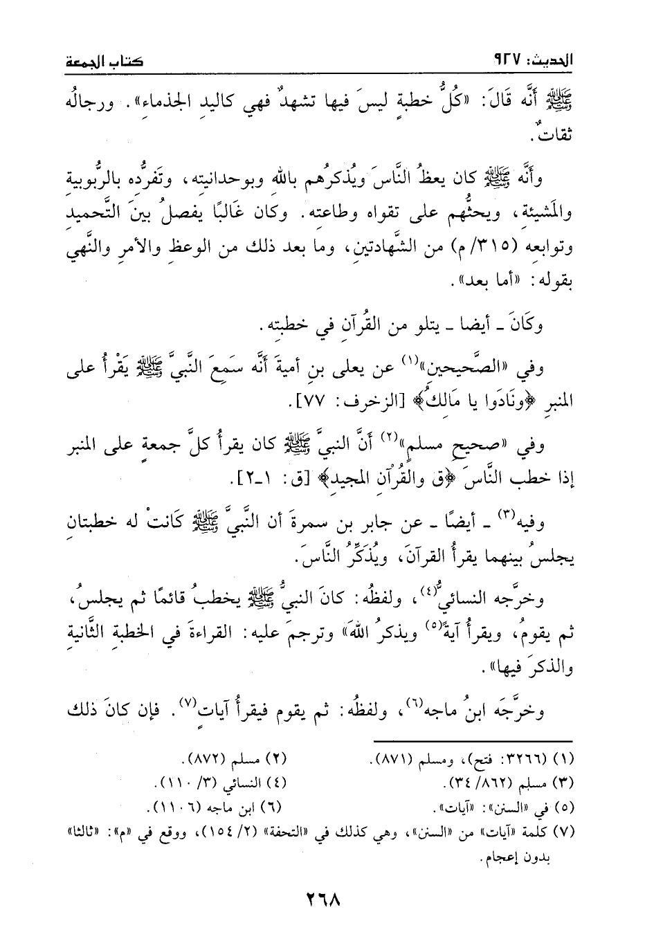 وخرّجه النسائي، ولفظه: ((كان النبي - صَلَّى اللهُ عَلَيْهِ وَسَلَّمَ - يخطب قائماً، ثم يجلس، ثم يقوم، ويقرأ آيات، ويذكر الله)) .