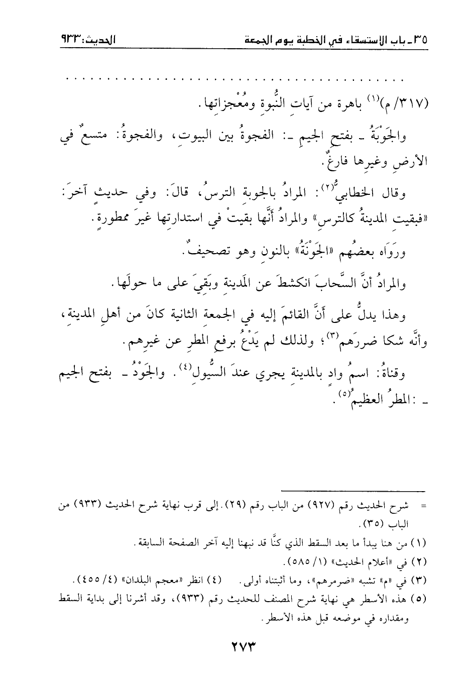 933 - حدثنا إبراهيم بن المنذر: ثنا الوليد: ثنا أبو عمرو: حدثني إسحاق بن عبد الله بن أبي طلحة، عن أنس بن مالكٍ، قال: اصابت الناس سنةٌ على عهد النبي - صَلَّى اللهُ عَلَيْهِ وَسَلَّمَ -، فبينا - صَلَّى اللهُ عَلَيْهِ وَسَلَّمَ - يخطب في يوم جمعةٍ قام أعرابيٌ، فقال: يا رسول الله، هلك المال، وجاع العيال، فادع الله لنا، فرفع يديه - وما نرى في السماء قزعة - ـ، فوالذي نفسي بيده، ما وضعها حتى ثار السحاب امثال الجبال، ثم لم ينزل عن منبره حتى رأيت المطر يتحادر على لحيته - صَلَّى اللهُ عَلَيْهِ وَسَلَّمَ -، فمطرنا يومنا ذلك، ومن الغد، وبعد الغد والذي يليه حتى الجمعة الأخرى. وقام ذلك الأعرابي –أو قال: غيره -، فقال: يا رسول الله، تهدم البناء، وغرق المال، فادع الله لنا، فرفع يديه فقال: ((اللهم، حوالينا، ولا علينا)) . فما يشير بيده إلى ناحية من السحاب الا انفرجت، وصارت المدينة مثل الجوبة وسال الوادي –قناة - شهراً، ولم يجئ احد من ناحية الا حدث بالجود)) } .