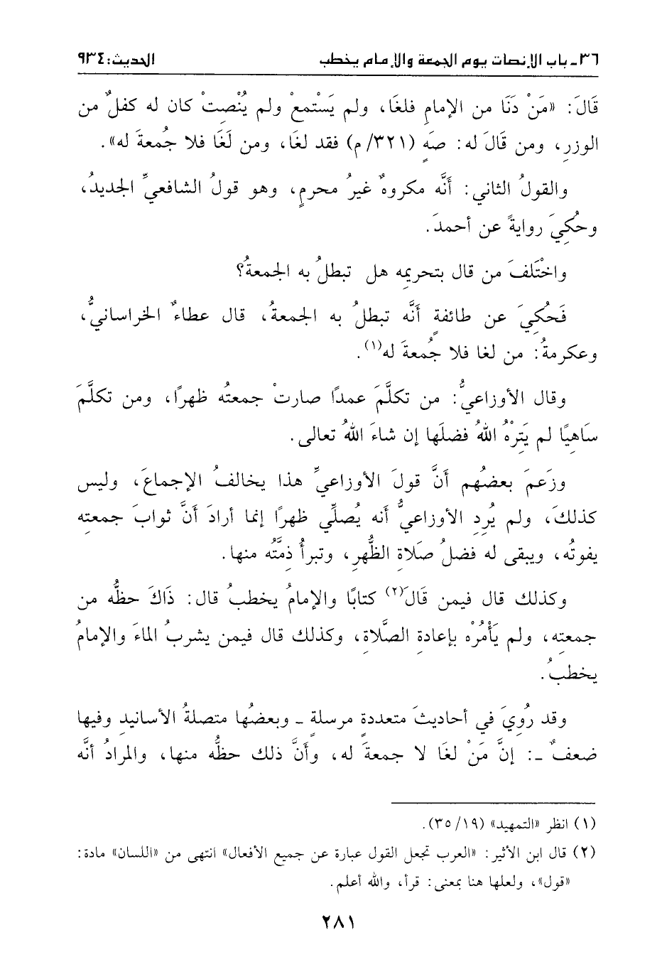 وقد روي في احاديث متعددةٍ مرسلةٍ، وبعضها متصلة الأسانيد، وفيها ضعف، أن من لغا لا جمعةٍ له، وأن ذلك حظه منها.