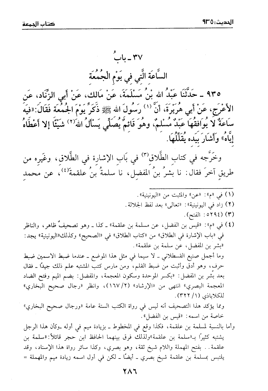 935 - حدثنا عبد الله بن مسلمة، عن مالكٍ عن أبي الزناد، عن الأعرج عن أبي هريرة، أن النبي - صَلَّى اللهُ عَلَيْهِ وَسَلَّمَ - ذكر يوم الجمعة، فقال: ((فيه ساعةٌ لا يوافقها عبدٌ مسلمٌ، وهو قائمٌ يصلي يسال الله شيئاً، إلا أعطاه إياه)) - وأشار بيده يقللها.