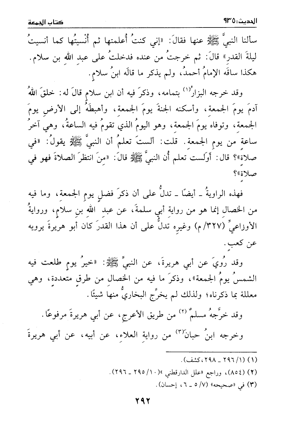 وقد خرّجه البزار بتمامه، وذكر فيه: أن ابن سلامٍ قال له: خلق الله آدم يوم الجمعة، وأسكنه الجنة يوم الجمعة، وأهبطه إلى الأرض يوم الجمعة، وتوفاه يوم الجمعة، وهو اليوم الذي تقوم فيه الساعة، وهي آخر ساعةٍ من يوم الجمعة. قلت: ألست تعلم أن النبي - صَلَّى اللهُ عَلَيْهِ وَسَلَّمَ - يقول: ((في صلاةٍ)) ؟ قال: أولست تعلم أن النبي - صَلَّى اللهُ عَلَيْهِ وَسَلَّمَ - قال: ((من انتظر الصلاة فهو في صلاة)) ؟ .