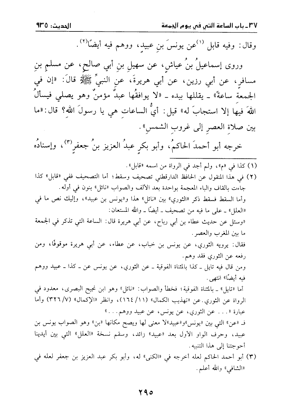 وروى إسماعيل بن عياش، عن سهيل بن أبي صالحٍ، عن مسلم بن مسافر، عن أبي رزين، عن أبي هريرة، عن النبي - صَلَّى اللهُ عَلَيْهِ وَسَلَّمَ -، قال: ((إن في الجمعة ساعةً)) –يقللها بيده - ((لا يوافقها عبدٌ مؤمنٌ وهو يصلي، فيسأل الله فيها إلا استجاب له)) . قيل: أي الساعات هي يا رسول الله؟ قال: ((ما بين صلاة العصر إلى غروب الشمس)) .
