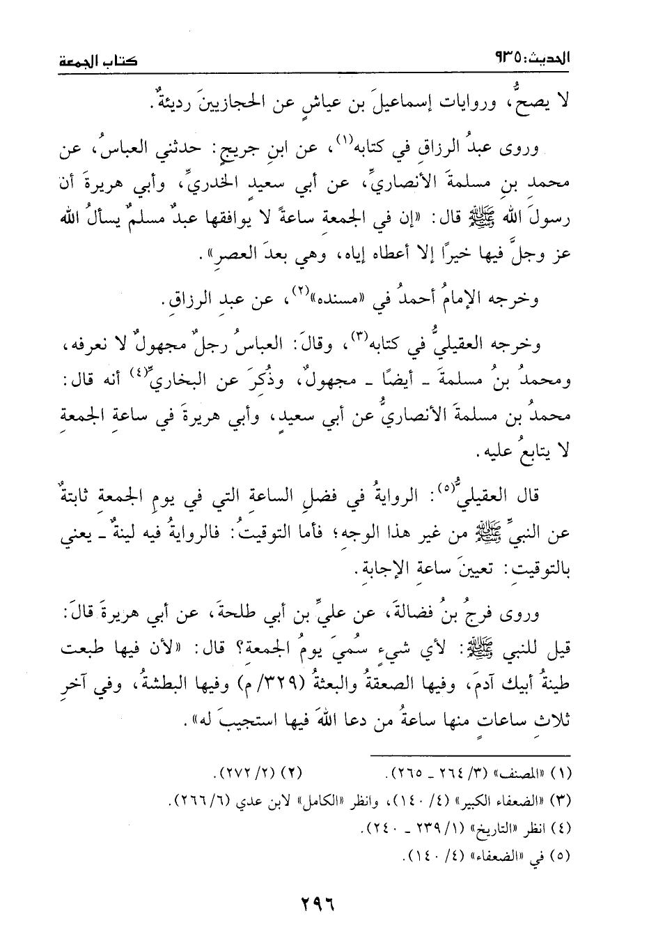 قال العقيلي: الرواية في فضل الساعة التي في يوم الجمعة ثابتهٌ عن النبي - صَلَّى اللهُ عَلَيْهِ وَسَلَّمَ - من غير هذا الوجه، فأما التوقيت، فالرواية فيه لينةٌ.