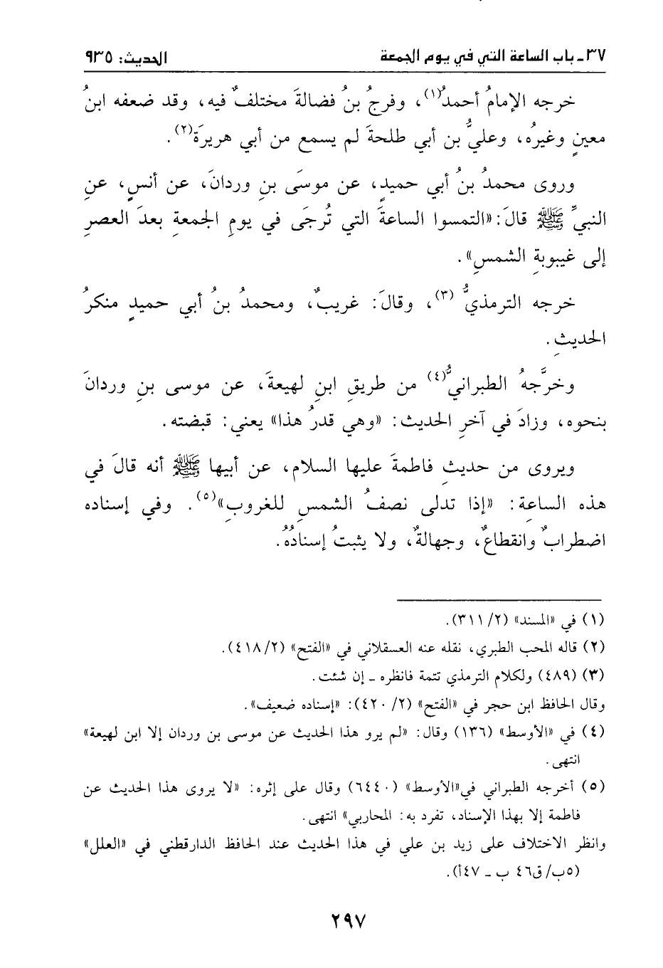 وروى محمد بن أبي حميد، عن موسى بن وردان، عن أنسٍ، عن النبي - صَلَّى اللهُ عَلَيْهِ وَسَلَّمَ -، قال: ((إلتمسوا الساعة التي ترجى في يوم الجمعة بعد العصر، إلى غيبوبة الشمس)) .