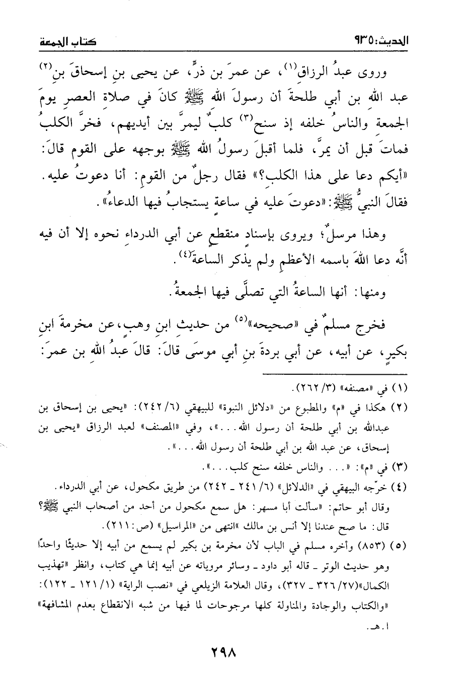 وروى عبد الرزاق، عن عمر بن ذر، عن يحيى بن إسحاق بن عبد الله بن أبي طلحة، أن رسول الله - صَلَّى اللهُ عَلَيْهِ وَسَلَّمَ - كان في صلاة العصر يوم الجمعة، والناس خلفه إذ سنح كلبٌ ليمر بين أيديهم، فخر الكلب فمات قبل أن يمر، فلما أقبل رسول الله - صَلَّى اللهُ عَلَيْهِ وَسَلَّمَ - بوجهه على القوم قال: ((أيكم دعا على هذا الكلب؟)) فقال رجل من القوم: أنا دعوت عليه. فقال النبي - صَلَّى اللهُ عَلَيْهِ وَسَلَّمَ -: ((دعوت عليه في ساعة يستجاب فيها الدعاء)) .
