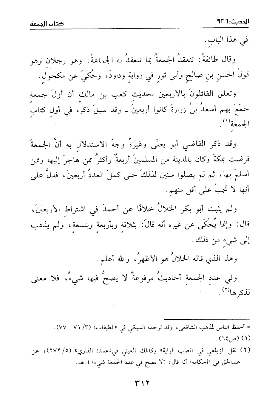 وقد ذكر القاضي أبو يعلى وغيره وجه الاستدلال به: أن الجمعة فرضت بمكة، وكان بالمدينة من المسلمين أربعةٌ وأكثر ممن هاجر إليها وممن أسلم بها، ثم لم يصلوا [ ... ] كذلك حتى كمل العدد أربعين، فدل على أنها لا تجب على أقل منهم، ولم يثب أبو بكر الخلال خلافه عن أحمد في اشتراط الأربعين.