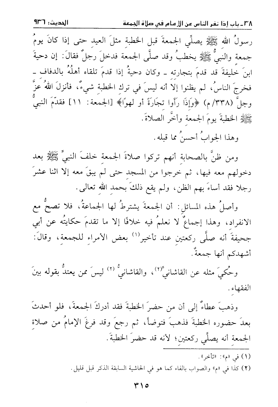 رسول الله - صَلَّى اللهُ عَلَيْهِ وَسَلَّمَ - يصلى الجمعة قبل الخطبة مثل العيد، حتى إذا كان يوم الجمعة والنبي - صَلَّى اللهُ عَلَيْهِ وَسَلَّمَ - يخطب، وقد صلى الجمعة، فدخل رجل، فقال: إن دحية بن خليفة قد قدم بتجارته – وكان دحية إذا قدم تلقاه أهله بالدفاف -، فخرج الناس، لم يظنوا إلا أنه ليس في ترك الخطبة شيء، فانزل الله عز وجل: {وَإِذَا رَأَوْا تِجَارَةً أَوْ لَهْواً} [الجمعة:11] ، فقدم النبي - صَلَّى اللهُ عَلَيْهِ وَسَلَّمَ - الخطبة يوم الجمعة، وأخر الصلاة.