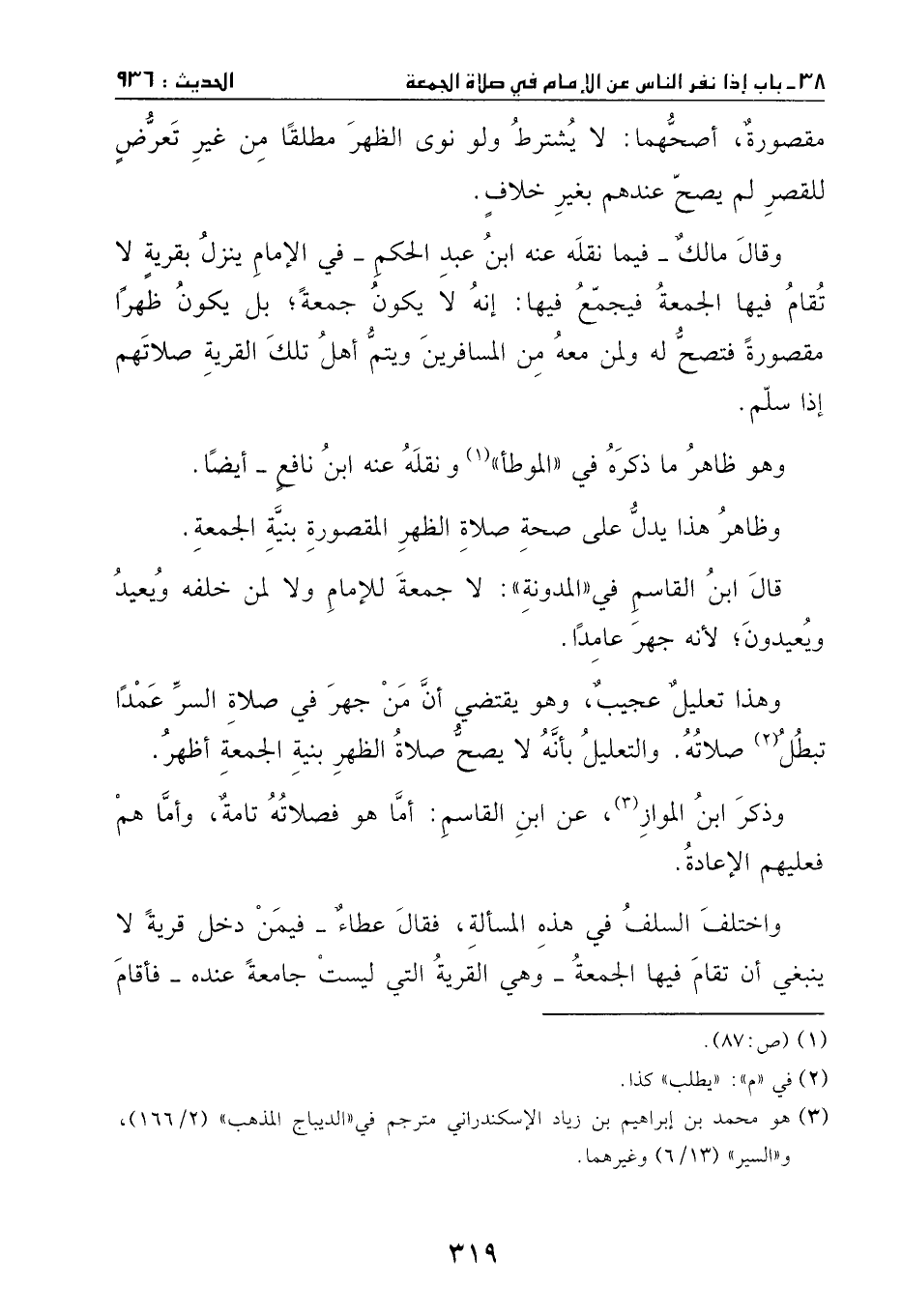 وقال مالك - فيما نقله عنه ابن عبد الحكم - في الإمام ينزل بقرية لا تقام فيها الجمعة، فيجمع فيها: إنه لا يكون جمعة، بل يكون ظهرا مقصورة، فتصح له ولمن معه من المسافرين، ويتم أهل تلك القرية صلاتهم إذا سلم.