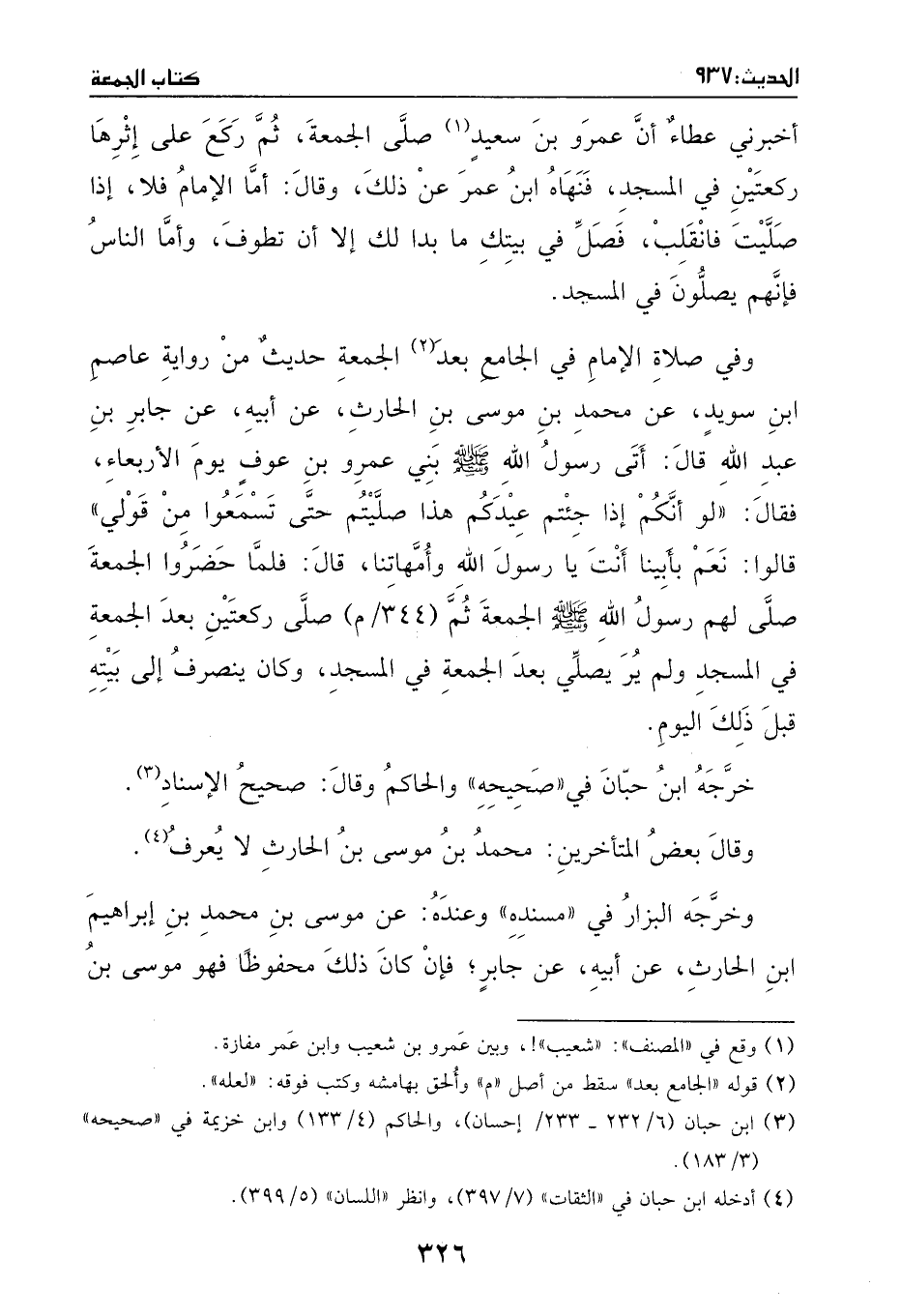 وفي صلاة الإمام في الجامع بعد الجمعة حديث، من رواية عاصم بن سويد، عن محمد بن موسى بن الحارث، عن أبيه، عن جابر بن عبد الله، قال: أتى رسول الله - صَلَّى اللهُ عَلَيْهِ وَسَلَّمَ - بني عمرو بن عوف يوم الأربعاء، فقال: " لو أنكم إذا جئتم عيدكم هذا صليتم حتى تسمعوا من قولي ". قالوا: نعم، بأبينا أنت يا رسول الله وأمهاتنا. قال: فلما حضروا الجمعة صلى لهم رسول الله - صَلَّى اللهُ عَلَيْهِ وَسَلَّمَ - الجمعة، ثم صلى ركعتين بعد الجمعة في المسجد، ولم ير يصلي بعد الجمعة في المسجد، وكان ينصرف إلى بيته قبل ذلك اليوم.