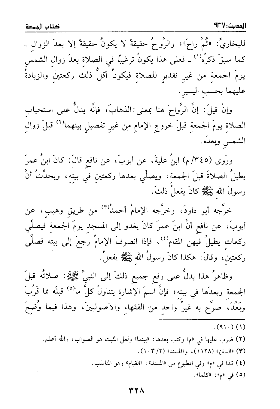 وروى ابن علية، عن أيوب، عن نافع، قال: كان ابن عمر يطيل الصلاة قبل الجمعة، ويصلي بعدها ركعتين في بيته، ويحدث أن رسول الله - صَلَّى اللهُ عَلَيْهِ وَسَلَّمَ - كان يفعل ذلك.