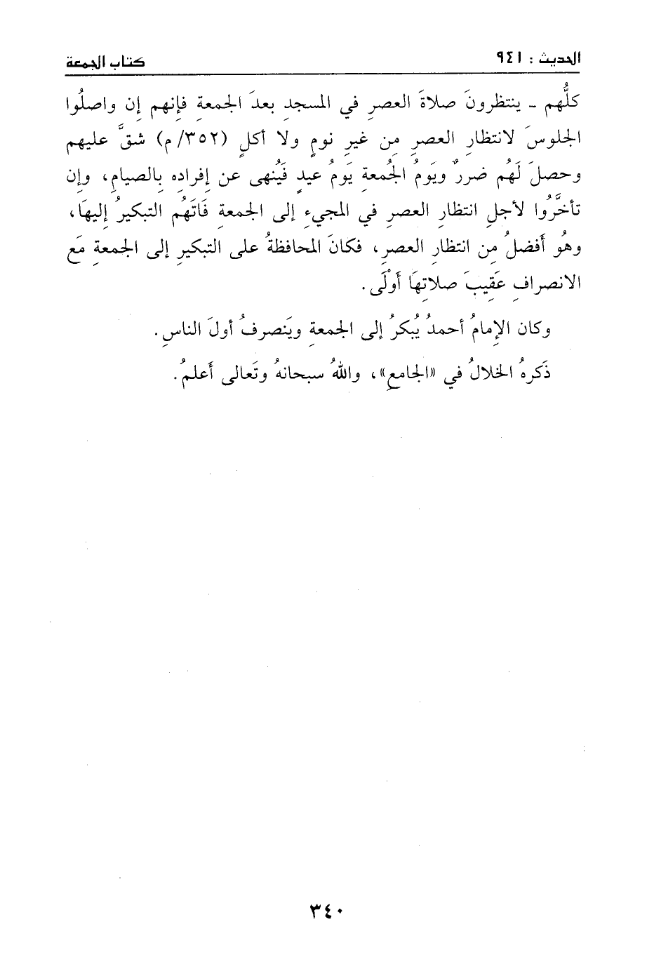 وكان الإمام أحمد يبكر إلى الجمعة، وينصرف أول الناس -: ذكره الخلال في " الجامع ". والله سبحانه وتعالى أعلم.