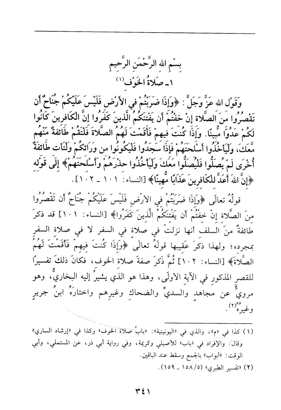 وقول الله - عز وجل -: {وَإذا ضَرَبْتُمْ فِي الأرض فَلَيْسَ عَلَيْكُمْ جُنَاحٌ أَنْ تَقْصُرُوا مِنَ الصَّلاةِ إِنْ خِفْتُمْ أَنْ يَفْتِنَكُمُ الَّذِينَ كَفَرُوا إِنَّ الْكَافِرِينَ كَانُوا لَكُمْ عَدُوّاً مُبِيناً - وَإذا كُنْتَ فِيهِمْ فَأَقَمْتَ لَهُمُ الصَّلاةَ فَلْتَقُمْ طَائِفَةٌ مِنْهُمْ مَعَكَ وَلْيَأْخُذُوا أَسْلِحَتَهُمْ فَإذا سَجَدُوا فَلْيَكُونُوا مِنْ وَرَائِكُمْ وَلْتَأْتِ طَائِفَةٌ أخرى لَمْ يُصَلُّوا فَلْيُصَلُّوا مَعَكَ وَلْيَأْخُذُوا حِذْرَهُمْ وَأَسْلِحَتَهُمْ} إلى قوله: {إِنَّ اللَّهَ أَعَدَّ لِلْكَافِرِينَ عَذَأبا مُهِيناً} [النساء: 101 - 102] قوله تعالى: {وَإذا ضَرَبْتُمْ فِي الْأرض فَلَيْسَ عَلَيْكُمْ جُنَاحٌ أَنْ تَقْصُرُوا مِنَ الصَّلاةِ إِنْ خِفْتُمْ أَنْ يَفْتِنَكُمُ الَّذِينَ كَفَرُوا} .