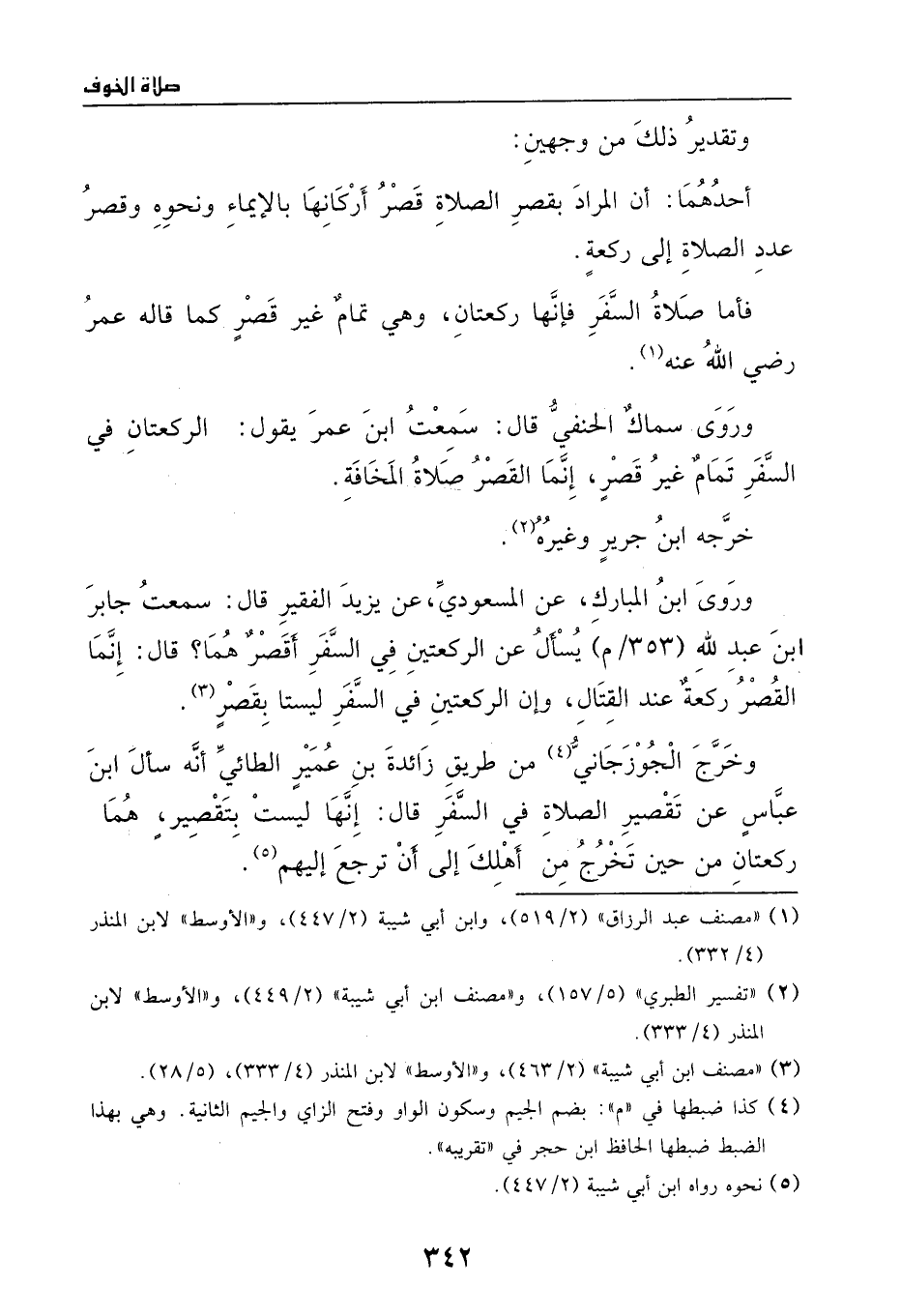 وروى ابن المبارك عن المسعودي، عن يزيد الفقير، قال: سمعت جابر بن عبد الله يسأل عن الركعتين في السفر: أقصرٌهما؟ قالَ: إنما القصر ركعةٌ عندَ القتال، وإن الركعتين في السفر ليستا بقصرٍ.