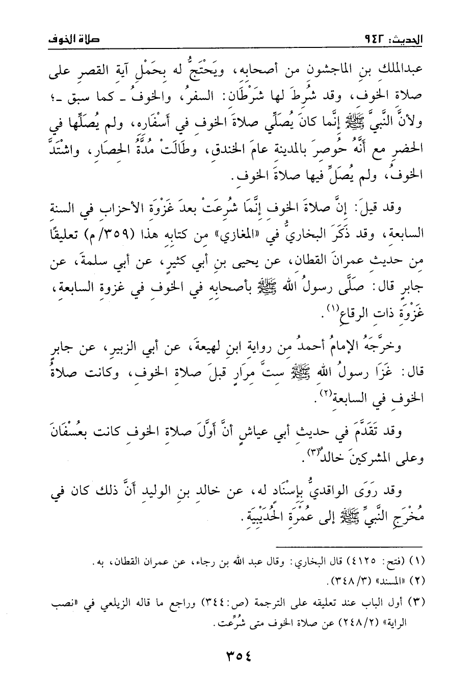 وقد ذكر البخاري في ((المغازي)) من كتابه هذا - تعليقا - من حديث عمران القطان، عن يحيى بن أبي كثير، عن أبي سلمة، عن جابر، قال: صلى رسول الله - صَلَّى اللهُ عَلَيْهِ وَسَلَّمَ - بأصحابه في الخوف في غزوة السابعة: غزوة ذات الرقاع.