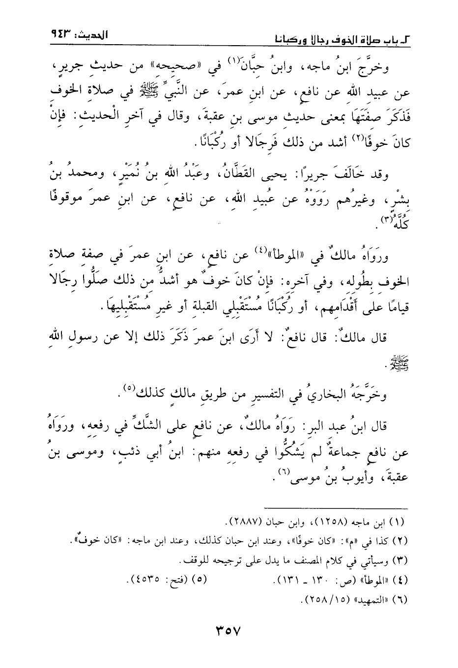 وخرج ابن ماجه وابن حبان في ((صحيحه)) من حديث جرير، عن عبيد الله بن عمر، عن نافع، عن ابن عمر، عن النبي - صَلَّى اللهُ عَلَيْهِ وَسَلَّمَ - في صلاة الخوف فذكر صفتها بمعنى حديث موسى بن عقبة، وقال في آخر الحديث: فإن كان خوفا أشد من ذلك فرجالا أو ركبانا.