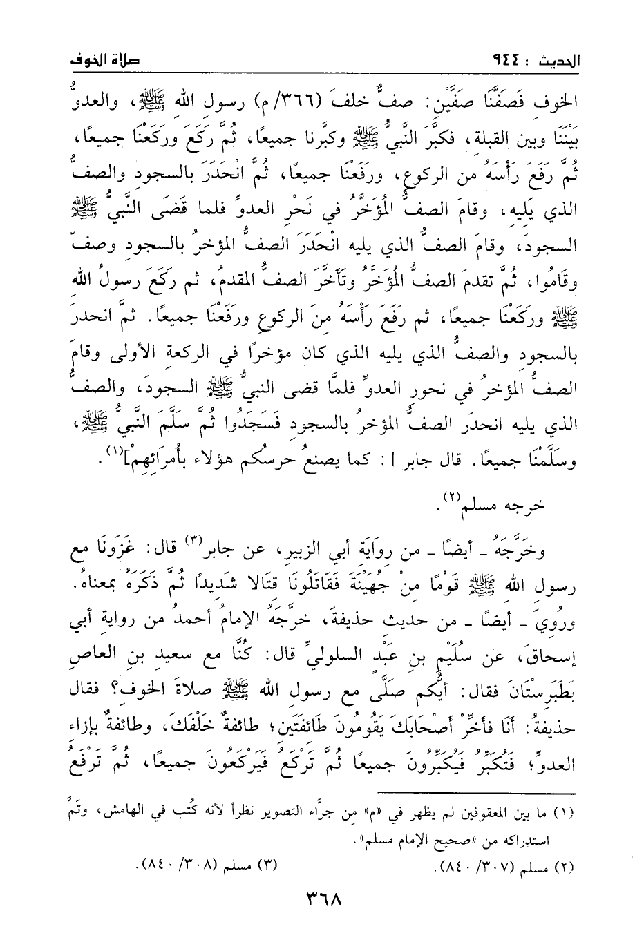 الخوف، وصفنا صفين، صف خلف رسول الله - صَلَّى اللهُ عَلَيْهِ وَسَلَّمَ - والعدو بيننا وبين القبلة، فكبر النبي - صَلَّى اللهُ عَلَيْهِ وَسَلَّمَ - ? وكبرنا جميعا، ثم ركع وركعنا جميعا، ثم رفع رأسه من الركوع ورفعنا جميعا، ثم انحدر بالسجود والصف الذي يليه، وقام الصف المؤخر في نحر العدو، فلما قضى النبي - صَلَّى اللهُ عَلَيْهِ وَسَلَّمَ - السجود، وقام الصف الذي يليه انحدر الصف المؤخر بالسجود وقاموا، ثم تقدم الصف المؤخر وتأخر الصف المقدم، ثم ركع رسول الله ? - صَلَّى اللهُ عَلَيْهِ وَسَلَّمَ - وركعنا جميعا، ثم رفع رأسه من الركوع ورفعنا جميعا، ثم انحدر بالسجود والصف الذي يليه الذي كان مؤخرا في الركعة الأولى، وقام الصف المؤخر في نحور العدو، فلما قضى النبي - صَلَّى اللهُ عَلَيْهِ وَسَلَّمَ - السجود والصف الذي يليه انحدر الصف المؤخر بالسجود فسجدوا، ثم سلم النبي - صَلَّى اللهُ عَلَيْهِ وَسَلَّمَ - وسلمنا جميعا.