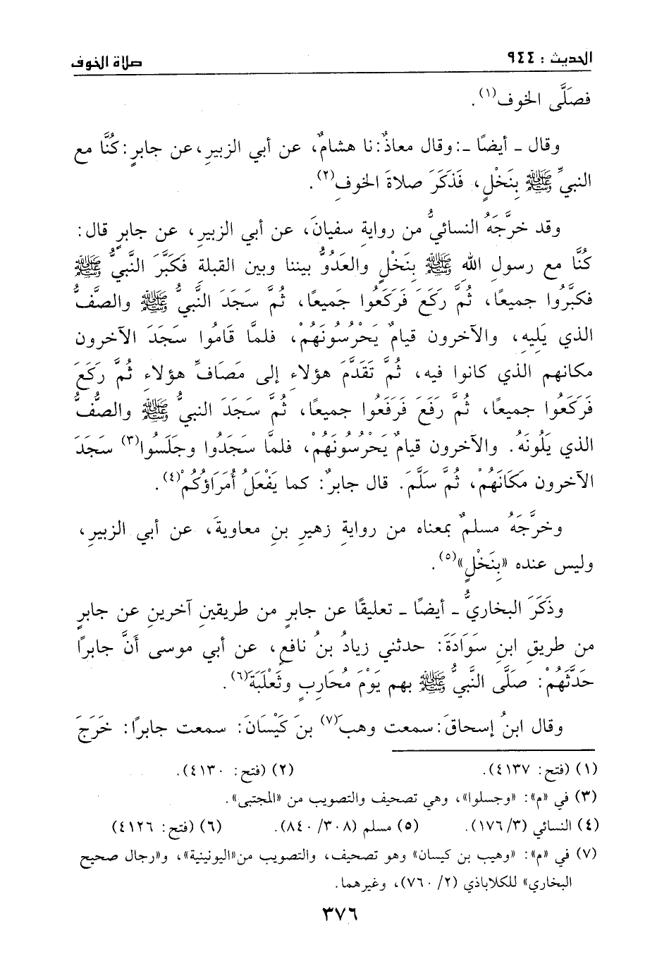 وقد خرجه النسائي من رواية سفيان، عن أبي الزبير، عن جابر، قالَ: كنا مع رسول الله - صَلَّى اللهُ عَلَيْهِ وَسَلَّمَ - بنخل، والعدو بيننا وبين القبلة، فكبر النبي - صَلَّى اللهُ عَلَيْهِ وَسَلَّمَ - فكبروا جميعاً، ثم ركع فركعوا جميعاً، ثم سجد النبي - صَلَّى اللهُ عَلَيْهِ وَسَلَّمَ - والصف الذي يليه، والآخرون قيام يحرسونهم، فلما قاموا سجد الآخرون مكانهم الذي كانوا فيهِ، ثم تقدم هؤلاء إلى مصاف هؤلاء، ثم ركع فركعوا جميعاً، ثم رفع فرفعوا جميعاً، ثم سجد النبي - صَلَّى اللهُ عَلَيْهِ وَسَلَّمَ - والصف الذين يلونه، والآخرون قيام يحرسونهم، فلما سجدوا وجلسوا سجد الآخرون مكانهم، ثم سلم.